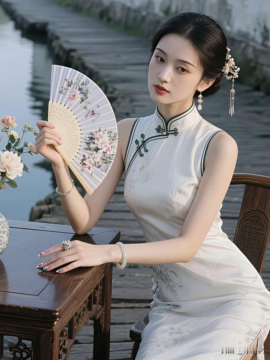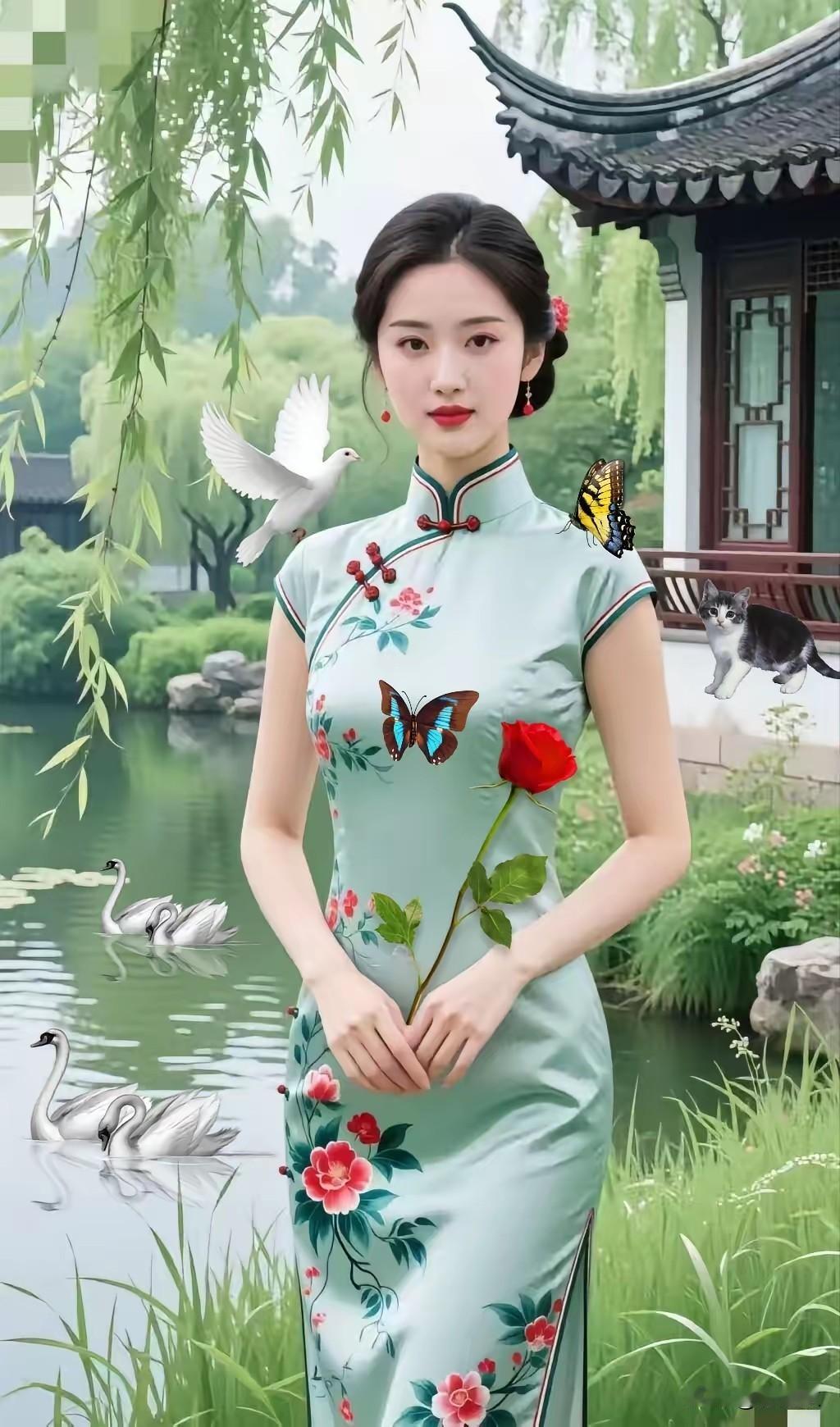 江南水乡,旗袍佳丽。 浅笑嫣然,惹人喜欢。 修身裁剪,风情无限。 旗袍之美,美在