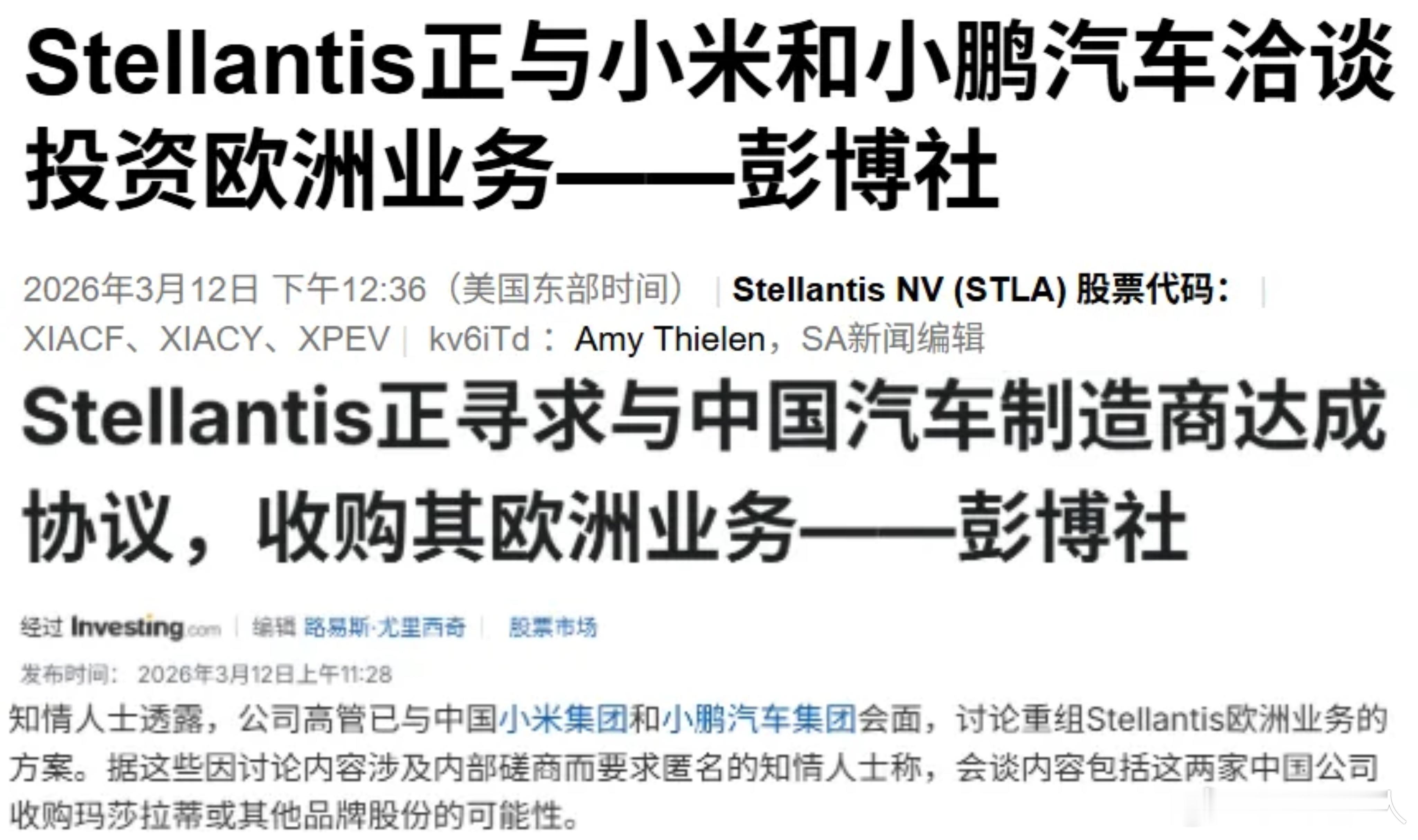说小米/小鹏收购玛莎拉蒂不纯属标题党吗,人家彭博社说的是洽谈欧洲投资业务,再说了,Stellantis旗下又不是只有玛莎拉蒂,欧宝菲亚特阿尔法罗密欧标致雪铁龙,没一个卖的好的,随便卖一个也比卖玛莎强啊。整个Stellantis去年巨亏223亿欧元,肯定想找资金,不过人家Stellantis已经辟谣了。