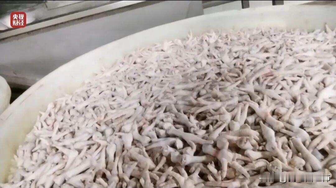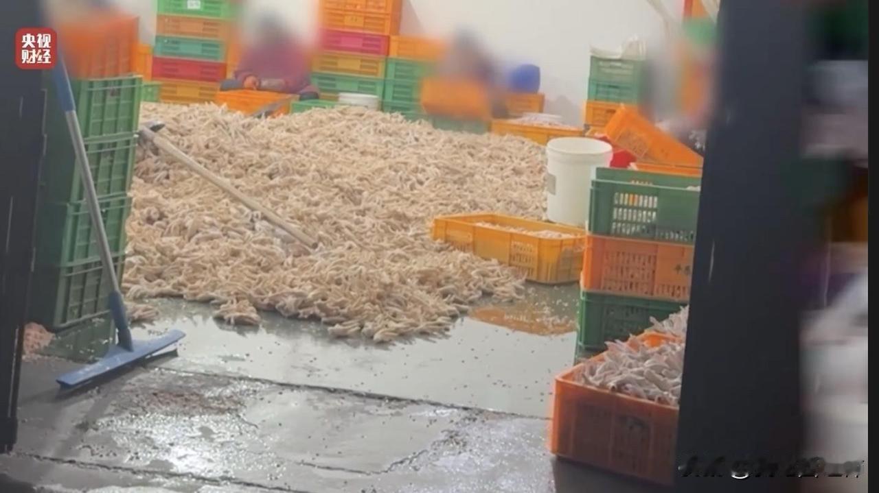 姐妹们 停嘴 别啃了315 曝光了 315鸡爪曝光·多角度实拍(央视/官媒截图) 1. 浸泡池全景(明扬/蜀福*车间) 大池里堆满被35%双氧水浸泡的鸡爪,液体浑浊,鸡爪被泡得异常白胖,与原料暗沉形成强烈对比。 2. 地面堆放+踩踏现场(成都明*食品) 大量鸡爪直接堆在污水横流的脏地面,扫帚、铁锹压在鸡爪上;工人踩过的鸡爪,随手捡起继续加工。 3. 双氧水原料桶(重庆曾*食品) 蓝色大桶清晰标注35%过氧化氢(双氧水),无食品级标识,是违规漂白的核心原料。 4. 车间脏乱全景 泡制区、修剪区臭气弥漫、污水淤积,塑料筐杂乱堆放,设备油污厚重,无任何卫生防护。