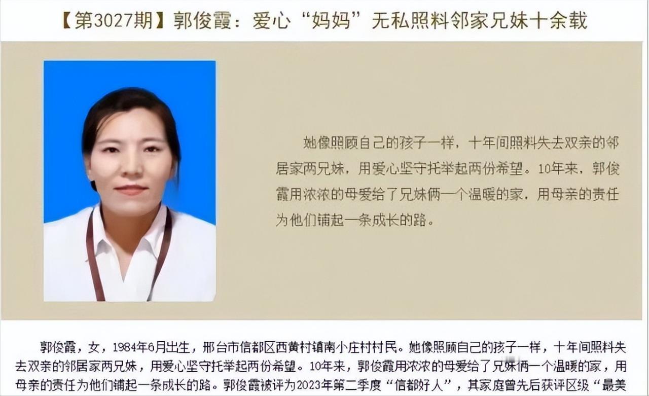 河北邢台1女子跟着丈夫跑大车为生,生活并不富裕,谁成想,邻居夫妻相继离世,留下一双儿女。女子于心不忍,对丈夫说:“隔壁两个孩子太可怜,接到我们家来吧。” 每天清晨天未亮,郭俊霞的丈夫就发动大货车,伴着轰鸣声踏上跑运输的路,常常数日才能归家。 31岁的郭俊霞扛起了家里的重担,照顾自家两个年幼的孩子,洗衣做饭、打理农田,日子紧巴巴却透着平淡的温暖。 郭俊霞和赵建花门对门相邻,两家都有两个年纪相仿的孩子,平日里抬头不见低头见。 每天下午放学,两人总会一起在村口等孩子,接送完后凑在一起聊家常、搭把手,邻里情谊在日复一日的相处中愈发深厚。 郭俊霞本以为这样的日子会一直延续,一场突如其来的变故,却打破了这份宁静,也给她的人生添了一份沉甸甸的责任。 2012年的一天,一向开朗的赵建花变得憔悴红肿,找到郭俊霞时浑身微微发抖,经检查,她被确诊为乳腺癌,需立刻住院治疗。 可家里两个孩子尚小,11岁的岩瑞和3岁的岩鑫无人照料,郭俊霞看着闺蜜无助的模样心如刀绞,明知自家条件有限,却终究放不下孩子和多年情谊,一口答应帮忙照看。 从那天起,岩瑞和岩鑫成了郭俊霞家的常客,吃饭、睡觉、写作业,郭俊霞待他们与亲生儿女别无二致,照料得无微不至。 可惜病魔无情,经过三年全力治疗,赵建花还是离开了人世。 丈夫郭军强一边处理后事、拉扯孩子,一边挣钱养家,长期的劳累与悲痛压得他喘不过气,仅仅几个月后,便因突发心肌梗塞追随妻子而去,两个孩子一夜之间沦为孤儿。 葬礼上,岩瑞强忍泪水、攥紧拳头,肩膀不停颤抖,年幼的岩鑫则扯着郭俊霞的衣角,一遍遍追问爸爸妈妈的归期,郭俊霞看着这一幕,心疼得落泪,一个坚定的念头在她心中升起:收养这两个孩子,给他们一个家。 当晚,郭俊霞等到丈夫跑车回家,说出了自己的想法。 丈夫十分为难,跑大车的收入勉强养活一家四口,再添两个孩子,日子只会更艰难。 郭俊霞没有退缩,耐心诉说自己的心意,最终,丈夫被她的善良打动,答应多跑几趟车,再苦再累也不让孩子受委屈。 岩瑞和岩鑫正式住进了郭俊霞家,六口人挤在不大的屋子里,日子愈发拮据。 郭俊霞更忙了,白天在田里忙活,晚上回家做饭、洗衣、辅导四个孩子写作业,常常忙到深夜;丈夫也愈发拼命,放弃所有休息时间跑运输,累了就睡在车里,从未有过一句抱怨。 刚到新家的岩瑞沉默寡言、眼神黯淡,常躲在角落发呆,夜里还会做噩梦惊醒流泪,郭俊霞每天陪他说话开导,夜里轻轻搂着他安抚,慢慢帮他走出伤痛。 胆小敏感的岩鑫,也在郭俊霞的细心照料下渐渐开朗,慢慢接纳了这个新家庭。 郭俊霞对待四个孩子从未偏心,买衣物、文具永远都是四份,还叮嘱自家孩子多照顾哥哥妹妹,久而久之,四个孩子亲如手足,岩瑞也变得开朗自信,会主动帮忙做家务。 一年中秋节,郭俊霞夫妇张罗了一桌子饭菜,一家人围坐在一起格外温馨。 岩瑞趁郭俊霞端菜时,小声提出想喊她妈妈,郭俊霞红着眼眶点头答应,岩鑫也跟着软糯地喊出“妈妈”,丈夫笑着“吃醋”,逗孩子们喊自己爸爸,小院里满是欢声笑语。 十年转瞬即逝,在郭俊霞夫妇的悉心照料下,四个孩子健康成长。 岩瑞努力学习,最终穿上军装,成为一名优秀的空军机械师,用行动回报养育之恩;岩鑫也乖巧上进,成绩名列前茅,成了品学兼优的好学生。 郭俊霞的事迹在当地传开,爱心人士纷纷捐款,政府也给予补助,可她分文未动,将捐款交给孩子的爷爷奶奶保管,坚持靠自己的努力拉扯孩子长大。 2023年,郭俊霞的善良与坚守得到认可,她获评“信都好人”“时代新人·河北好人”,家庭也获得“文明家庭”“最美家庭”等称号。 面对荣誉,她十分淡然,坦言自己只是做了该做的事,不过是多养了两个孩子。 她只是一名普通农村妇女,没有丰厚收入和华丽言辞,却用十年坚守,为两个孤儿撑起一片晴空,诠释了“老吾老以及人之老,幼吾幼以及人之幼”的真谛,彰显了平凡人的不凡力量。