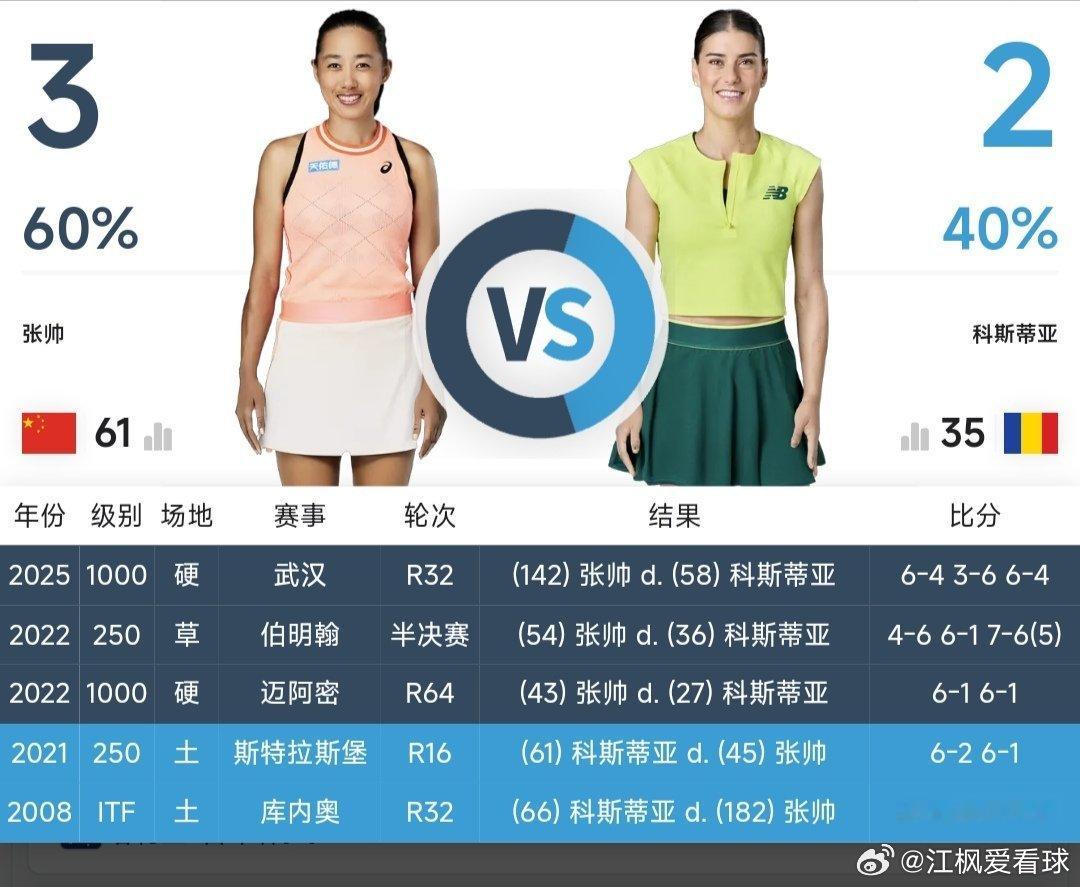 05:00左右 WTA1000迈阿密站女单第1轮张帅🇨🇳 vs 科斯蒂亚🇷🇴