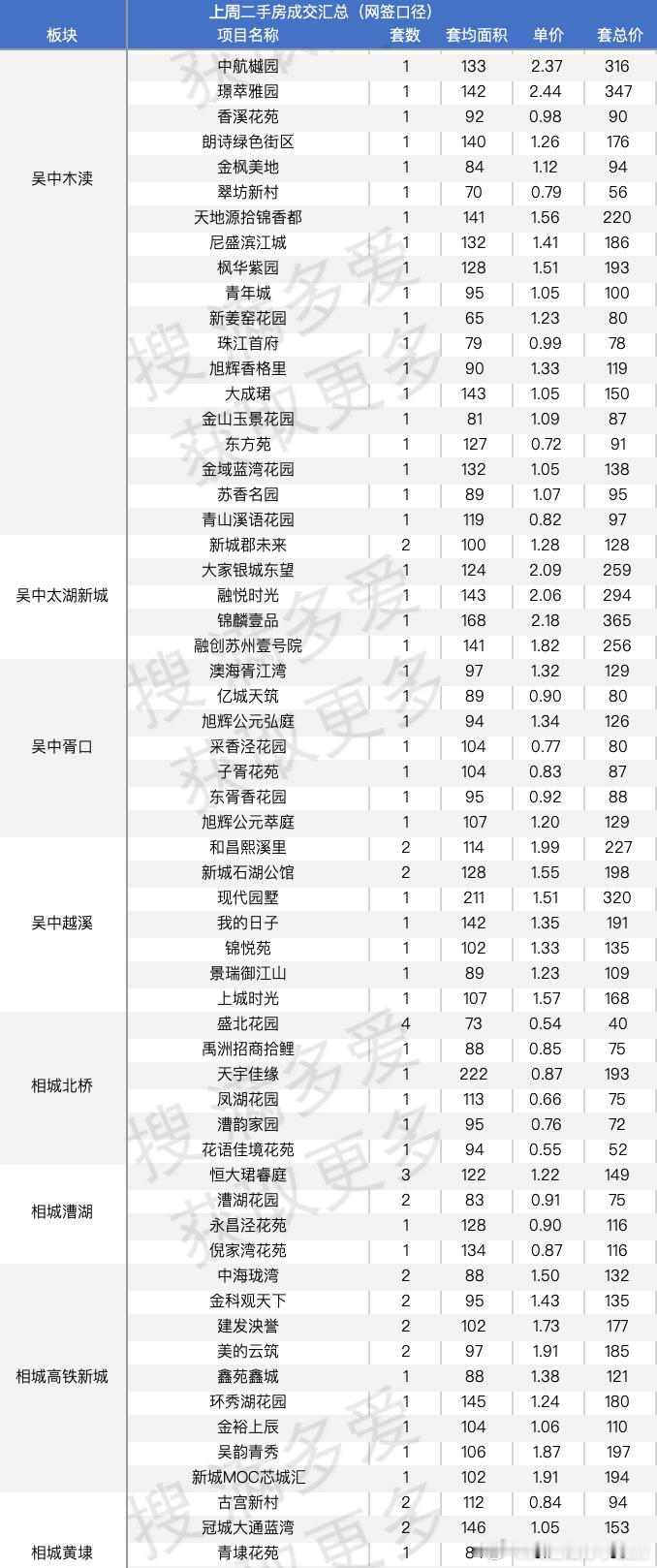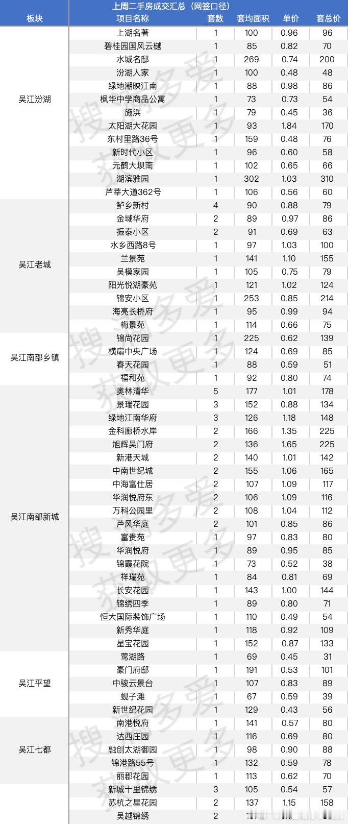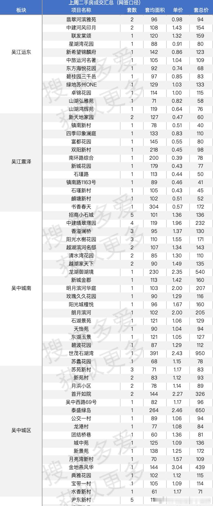 苏州上周二手房成交汇总含所有中介平台的上周二手房网签量已经过1000套了从量来看,苏州恢复的还挺快的说说具体项目吧一些很新的小区,依旧有陆续的网签说说名字园区,万科朗拾,青剑湖的建发青云上,奥体的绿城云庐新区的中粮狮山壹号说说有量的小区吧还是沧浪新城的世茂运河城,当然也是因为组团多,房子多,4套还有是吴江太湖新城的首开太湖一号,5套吴中的是招商小石城,5套中建晴翠璟园,这个新房还在售的,竟然有二手成交了,4套相城区,就是活力岛的首开班芙春天5套,同板块的水漾花城4套园区还是老牌的,九龙仓时代上城,4套,太阳城4套都说唐宁府是唐村,但是当价格跌下来后从伪豪宅变成普通二改小区定位,还是香的上周成交2套同板块颐和玲珑继续出货,有3套就这么多吧
