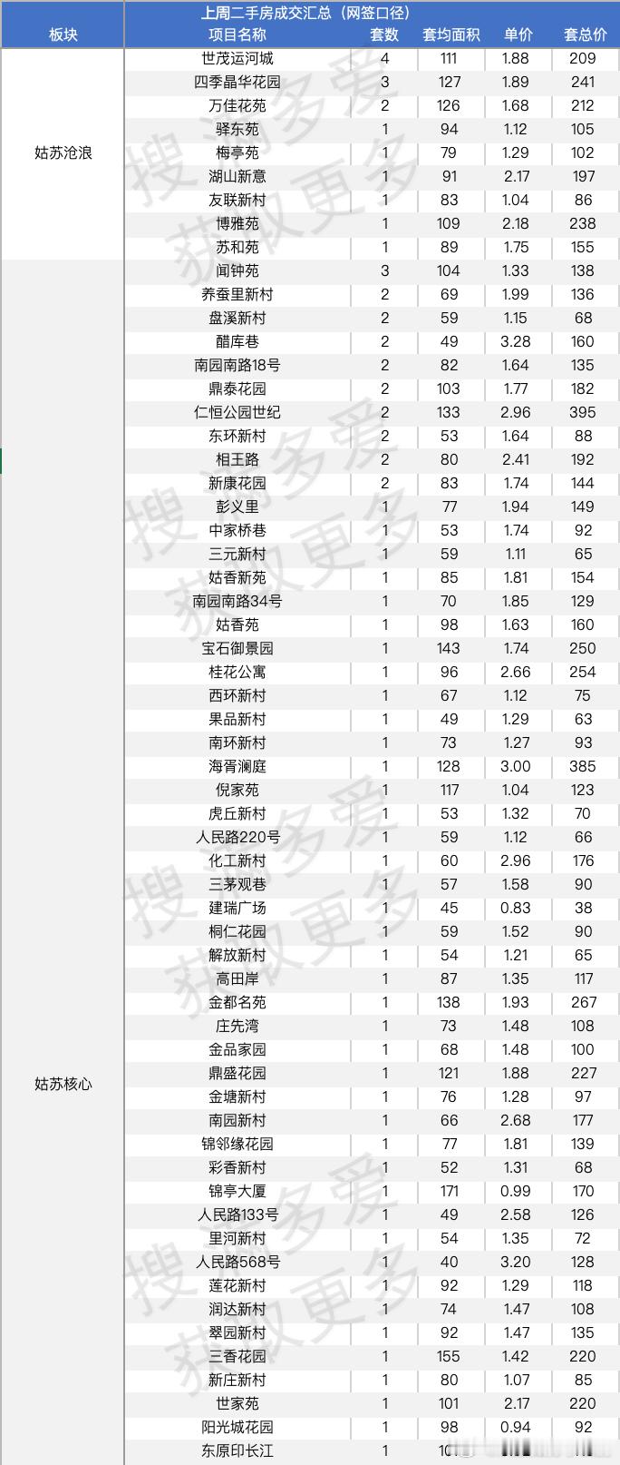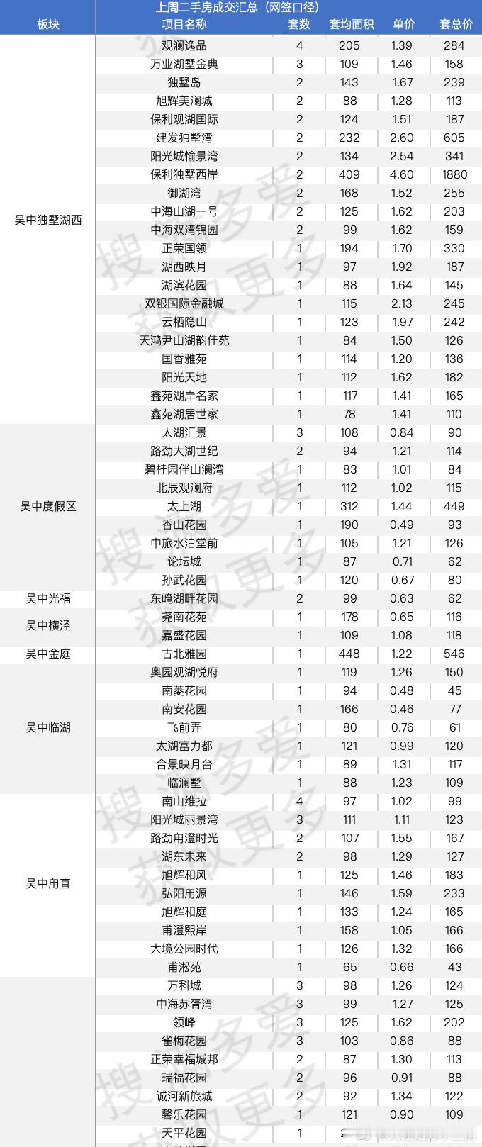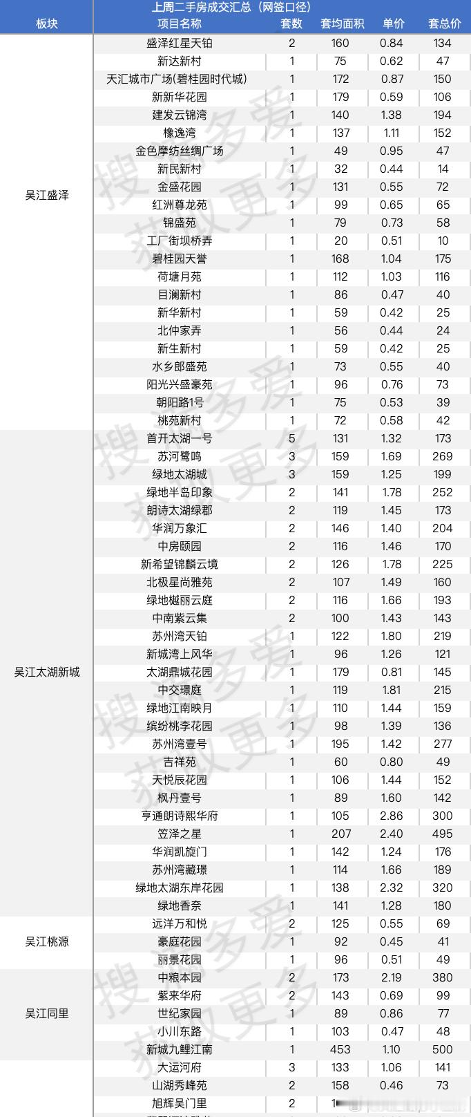 苏州上周二手房成交汇总含所有中介平台的上周二手房网签量已经过1000套了从量来看,苏州恢复的还挺快的说说具体项目吧一些很新的小区,依旧有陆续的网签说说名字园区,万科朗拾,青剑湖的建发青云上,奥体的绿城云庐新区的中粮狮山壹号说说有量的小区吧还是沧浪新城的世茂运河城,当然也是因为组团多,房子多,4套还有是吴江太湖新城的首开太湖一号,5套吴中的是招商小石城,5套中建晴翠璟园,这个新房还在售的,竟然有二手成交了,4套相城区,就是活力岛的首开班芙春天5套,同板块的水漾花城4套园区还是老牌的,九龙仓时代上城,4套,太阳城4套都说唐宁府是唐村,但是当价格跌下来后从伪豪宅变成普通二改小区定位,还是香的上周成交2套同板块颐和玲珑继续出货,有3套就这么多吧