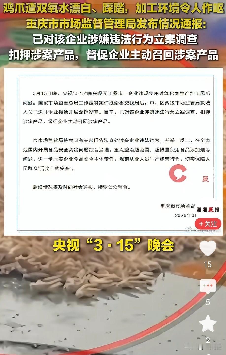 3.15晚会曝光“漂白鸡爪”背后:我们能看到的,和我们看不到的 今年的央视3.15晚会,第一个案例就曝光了川渝两地多家食品企业在生产“泡制凤爪”过程中,违规使用双氧水(过氧化氢)漂白鸡爪,车间环境脏乱差问题。 直播画面显示,节目播出前,国家市场监管总局和四川、重庆两省属地市场监管部门其实已经对涉案违规生产企业进行了现场查处。晚会播出后,重庆市市场监管局随即也发布了官方情况通报,表明“已对该企业涉嫌违法行为立案调查,扣押涉案产品,督促企业主动召回涉案产品”。 天眼查显示,3.15晚会曝光的违法生产企业成都市明扬食品有限责任公司成立于2007年,重庆市曾巧食品有限公司成立于2003年。而四川省蜀福香食品有限责任公司成立时间更早,是1997年,一家经营近30年的老牌企业。 如果说2015年10月1日我国《食品安全法》修订施行前这些食品企业管理不够规范还“情有可原”,但《食品安全法》实施后,对于食品生产经营企业的日常食品安全管理环节都制定了严格的条款规定,从原材料采购、添加剂使用、出厂检验记录制度等都做了详细要求。从央视晚会播出画面看,这些被曝光的食品生产企业车间环境令人作呕,还违法使用双氧水对鸡爪进行漂白,已经很明显存在多个违反《食品安全法》的行为,被查处是“罪有应得”! 但是,在这些食品企业被3.15晚会记者暗访曝光之前,它们这些违法行为应该不是进行了一天两天,一个月两个月吧?大家只看到了媒体曝光后属地市场监管部门的“雷厉风行”,却忽略这些职能机构日常监管的涉嫌失职渎职。 据我所知,所有合法食品生产经营企业都要办理食品经营许可,而企业取得的食品生产经营许可证上,有一项就明确标示了该食品企业的日常监督管理责任人员,最少是两人,还必须是辖区市场监督管理所正式职工。他们的职责,就是对辖区食品企业做好日常巡查检查,发现问题及时上报并依法处置。这也是《食品安全法》第一百一十条赋予县级以上食品安全监管部门的职责:执法人员可以进入生产经营场所实施现场检查,对生产经营的食品、食品添加剂、食品相关产品进行抽样检验。 可不管是蜀福香食品、明扬食品还是曾巧食品,这三家企业在被央视3.15记者暗访曝光前,居然没有一个被属地监管部门查到并处罚过,这就有点奇怪了吧?我国《食品安全法》和相关法律法规对食品生产经营企业实施的监督管理是分层级的,根据企业食品安全风险等级,实施的是一年1次到4次的严格现场逐项检查填报制度,而且还要做到食品安全检查信息公开公示。这一点,很显然四川邛崃市、重庆合川区的市场监管部门没有做好相关工作,有关责任人员涉嫌“不履行法定职责,对查处食品安全违法行为不配合,或者滥用职权、玩忽职守、徇私舞弊”。 这些问题,已经写进了《食品安全法》第一百四十五条。而第一百四十四条,也明确规定了食品安全监管部门的法律责任,就看相关部门有没有自行追责、自我疗毒的勇气了。 食品安全大于天,如果生产经营者不守法,监管部门不尽责,最终受害的都是消费者。 (金良辰)