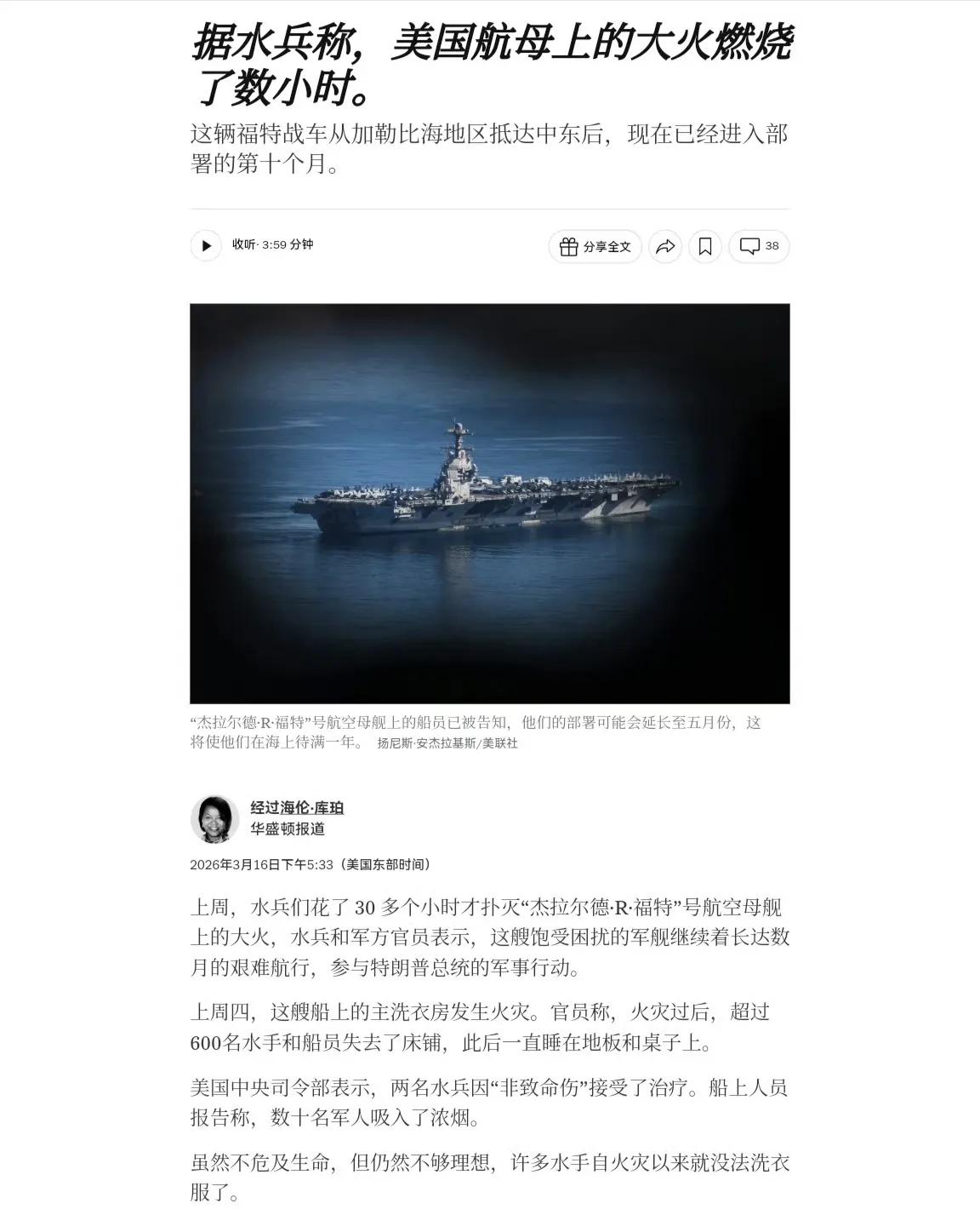 美国海军“福特”号航母日前发生的火灾竟然烧了30个小时,损管是干嘛的?导致600多名舰员失去床铺,真是离了大谱。从卫星照片看,火灾发生在舰岛部位,估计实际损伤情况要比报道还要严重,短时间内是没办法继续进行战斗部署了。 这艘号称美国海军最先进的航母最近是接连出丑,十分狼狈。造成连续不断的事故原因,不排除是和该航母海外部署时间严重超期有关。