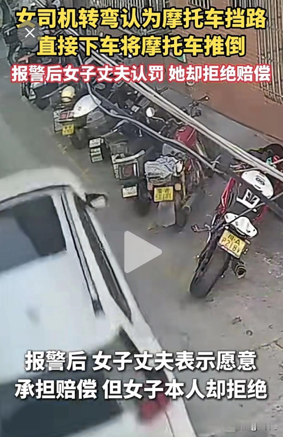 中山女司机神操作!嫌摩托挡路直接推倒,老公愿陪她一起扛,她却选择硬刚!网友直接笑喷! 广东中山出了件离谱事!3月15日,一女司机开车过窄路转弯,觉得路边摩托挡道,二话不说下车直接把摩托推倒,拍屁股走人,主打一个“我不爽我就毁”。 更绝的是后续:车主报警,老公明事理,当场表态愿意赔偿,结果女司机本人硬气到底,就是不赔! 网友直接笑不活了: “推倒也没挪位置,纯纯发泄!” ​“老公都低头了,她还硬刚?!” ​“就算越线,也不能直接毁东西啊。” 仔细看视频,就发现那摩托车因为车型较大,车轮是超出了停车线。 但女子将摩托车放倒后,摩托车所占路面面积也没有改变,依然是轮子在线外,并没有影响女子的车辆通行。 路窄不好开可以慢慢挪、找人帮,甚至摩托车真碍事就动手挪一下,都没问题。 这故意推倒他人车辆,既没素质还违法,轻则赔钱道歉,重则拘留罚款,这下脸丢大了,得不偿失! 素材来源:河南法治报,侵联删!