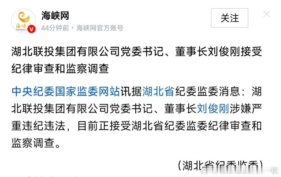 湖北联投集团有限公司党委书记、董事长刘俊刚接受纪律审查和监察调查。
