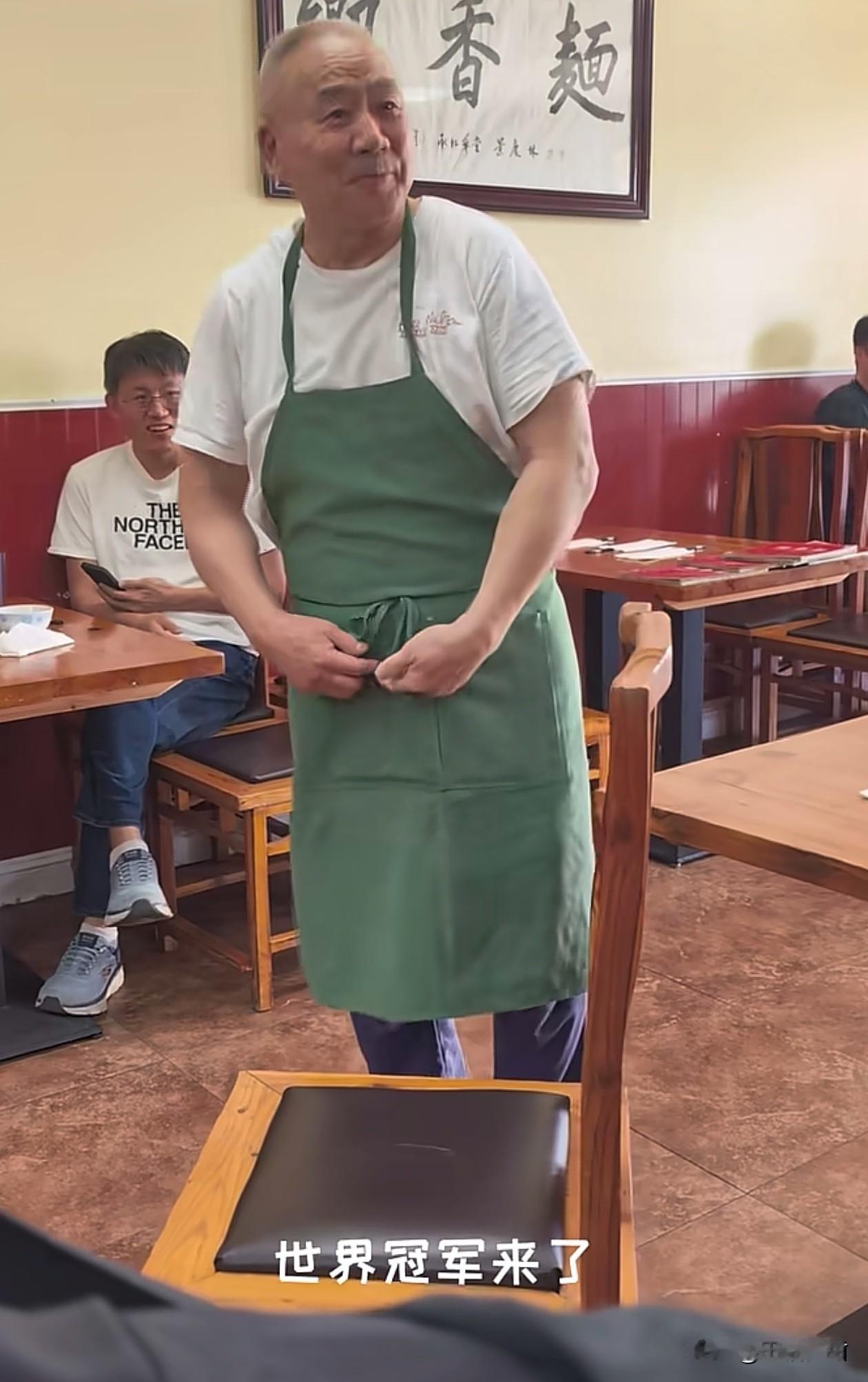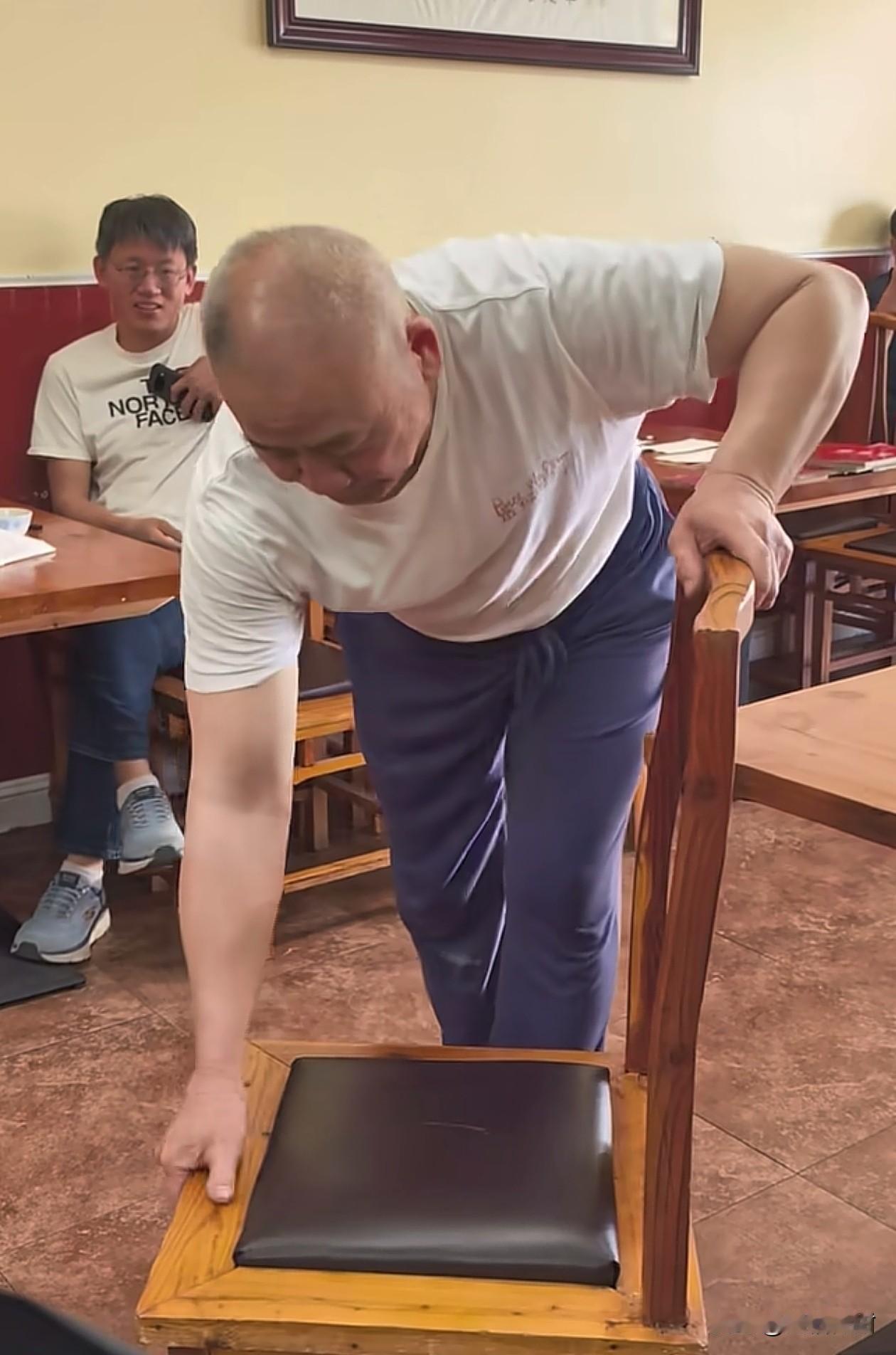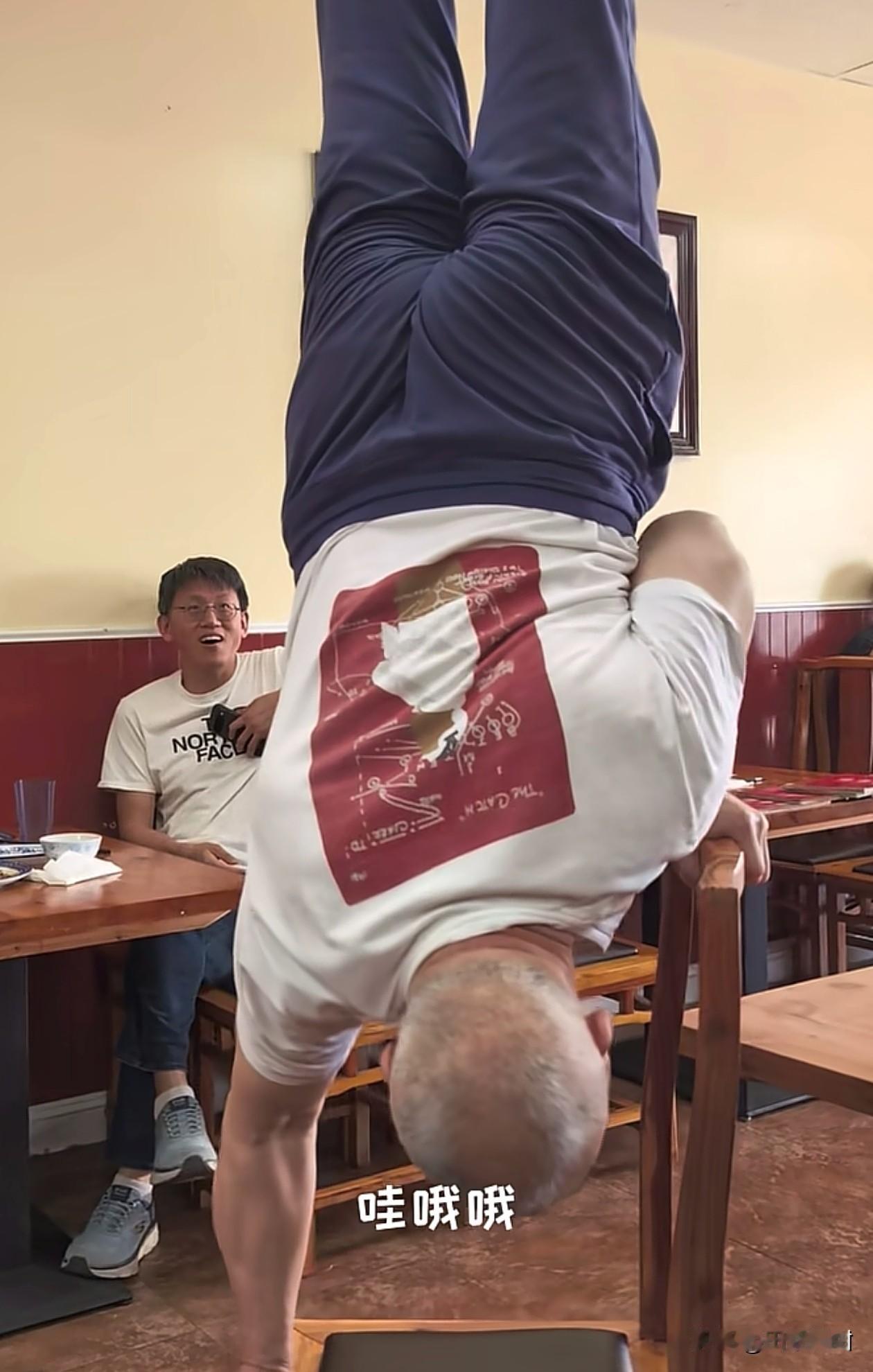 前世界冠军马索夫在美国开拌面馆。 他现场为客人表演在椅子上倒立,70岁还有这个核心力量,手臂上肌肉线条明显,看得出来身体素质很强了。 据悉,马索夫在1987年美国举行的第6届世界杯技巧赛中,他与队友陈刚、陈小伟、张世洪合作,获得男子四人全能、第一套和第二套三项世界冠军。