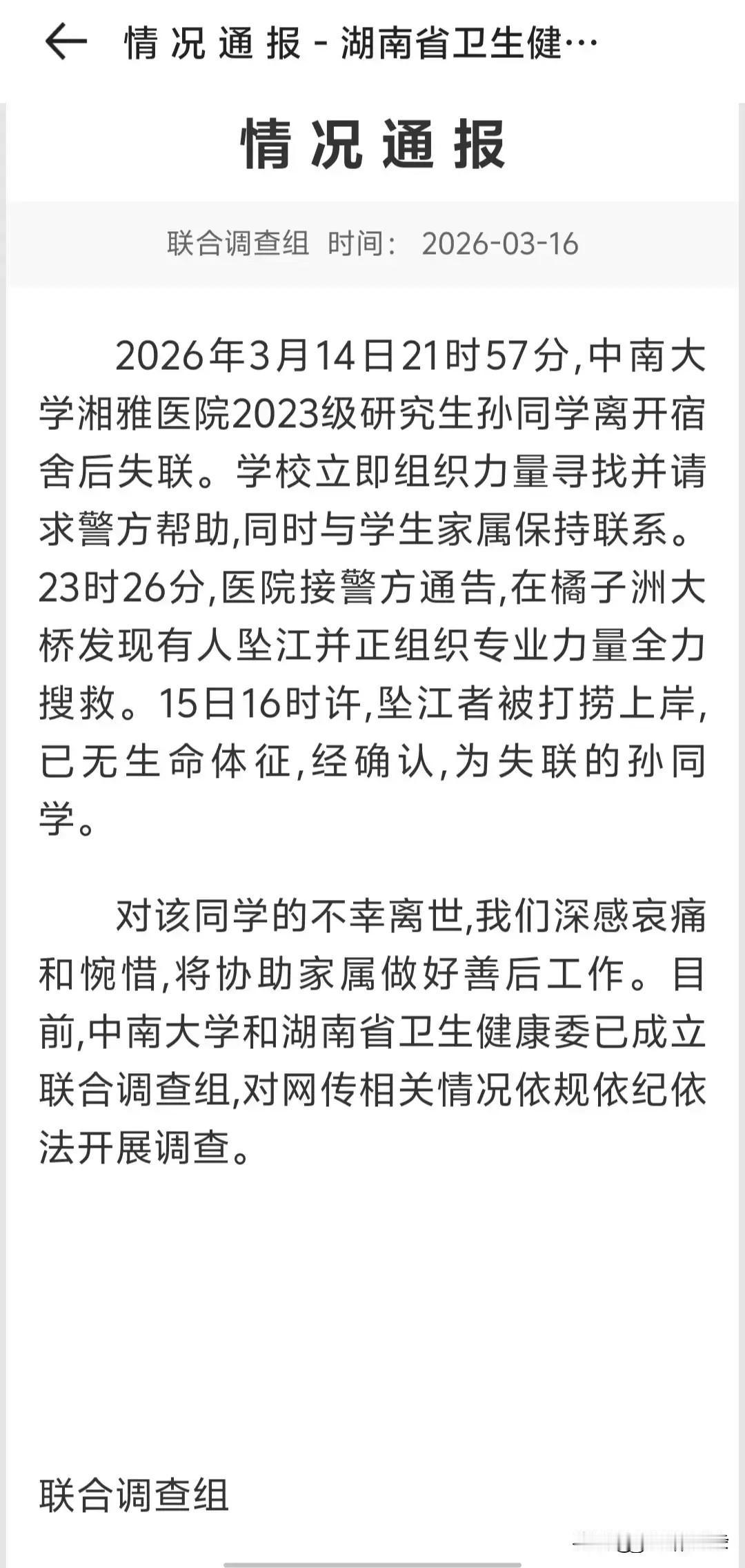 孙同学的父母怎么也不会想到, 曾引以为傲的女儿,竟然以如此惨烈的方式决绝而去![流泪] 要做一位医生要求极高,医学院门槛严格,本科要学五年课程,还要进行几年的实习!毕业只是起点,还要考研、规培!尤其能在湘雅这样的名院工作,她的父母一定曾与有荣焉!可如今他们悲痛欲绝,会后悔孩子魂断于此! 给人以启迪,天下父母总是“望子成龙,望女成凤”,总希望子女能出人头地!可千万要考虑到孩子可能会面临的压力和自身的心理承受能力,要帮助孩子选择适合自己发展的行业! 特别是对那些即将参加高考的学子以及家长,有现实意义!在择校和选专业方面,希望能多一些理性和自知!愿孙同学类似的悲剧不再![祈祷]