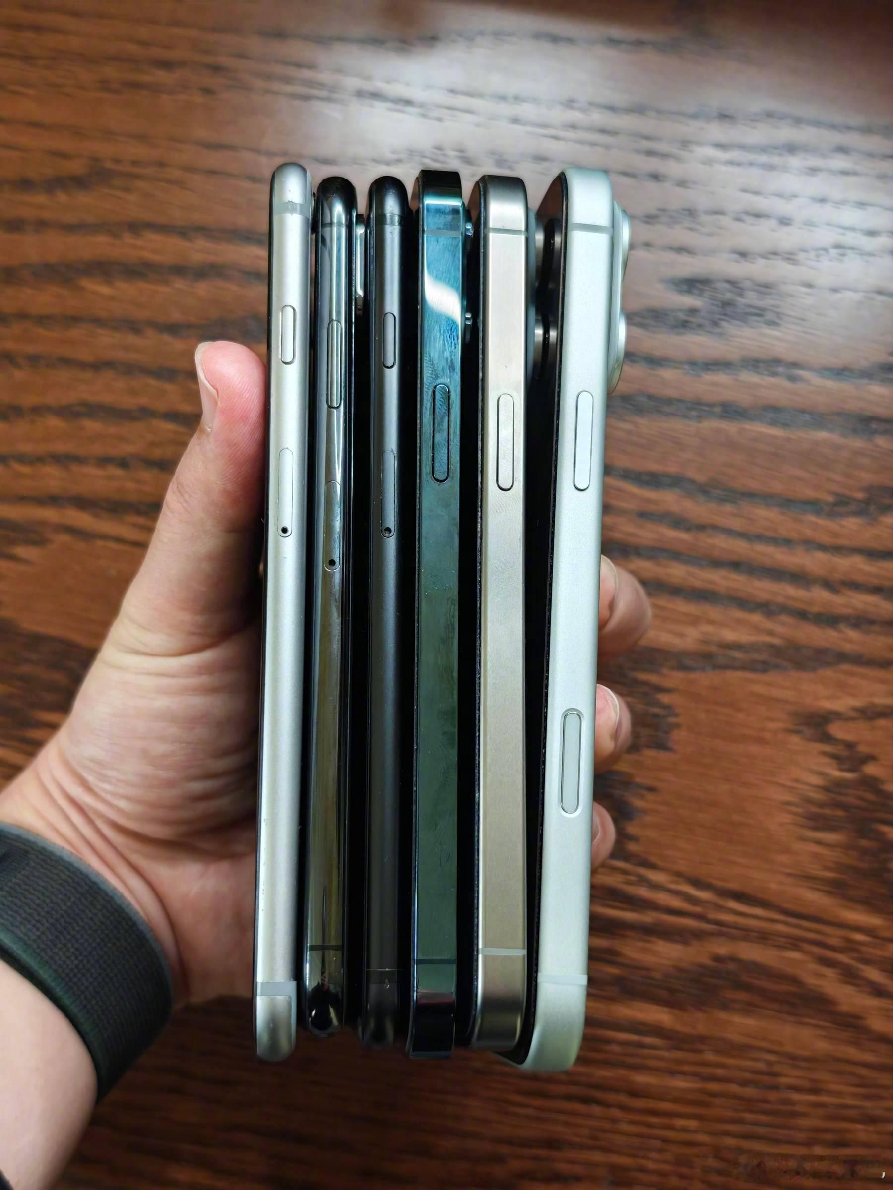 尾巴生活 手上的 iPhone 摞在一起,明显能看到设计语言的变化。初代到 3GS,圆润,4 到 5S,方正,6 到 XS,圆润,11 到 14,方正,15 到 17,略圆润。对比才感受到 6 到 XS 有多薄,那时手感是真好。