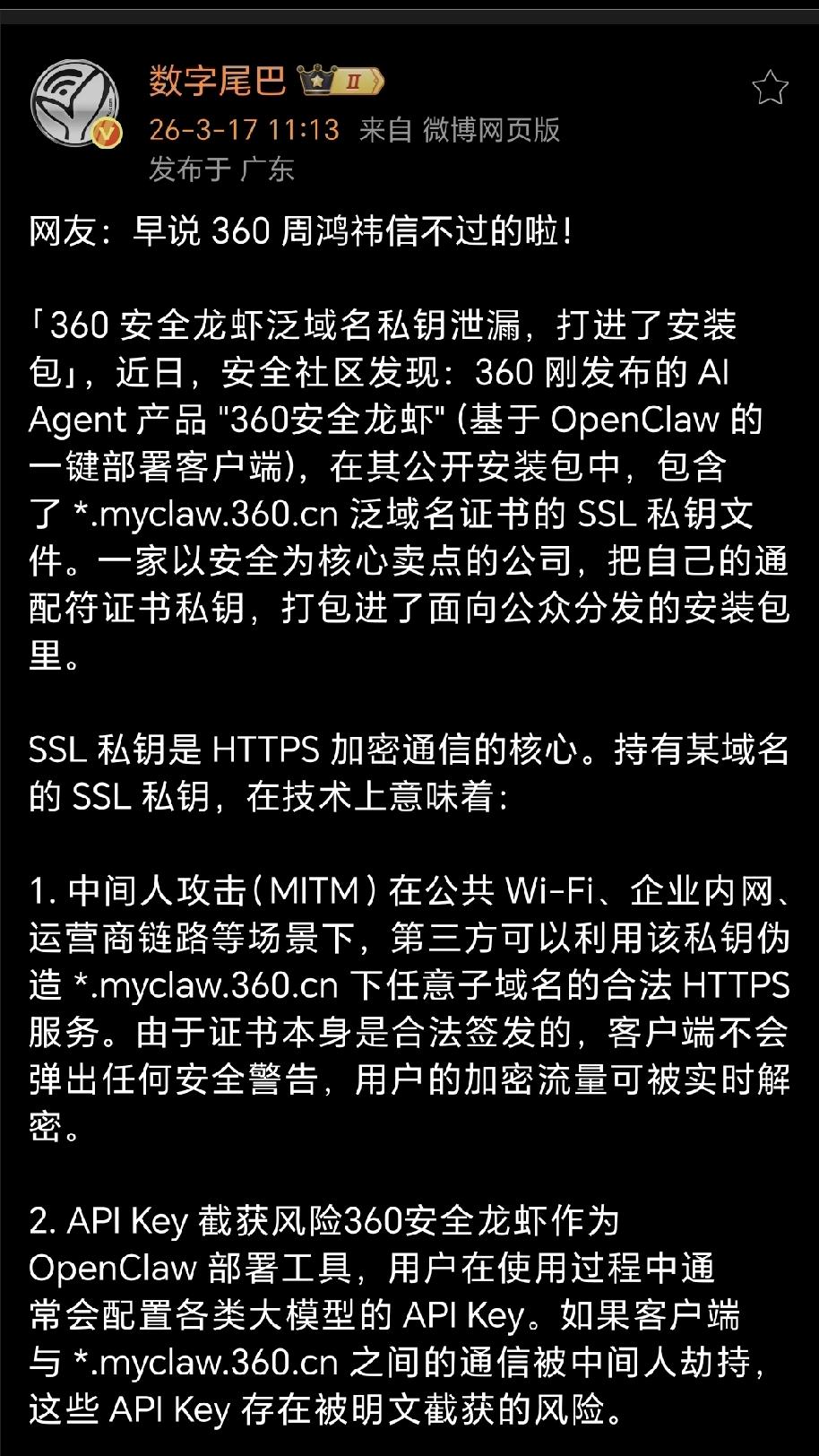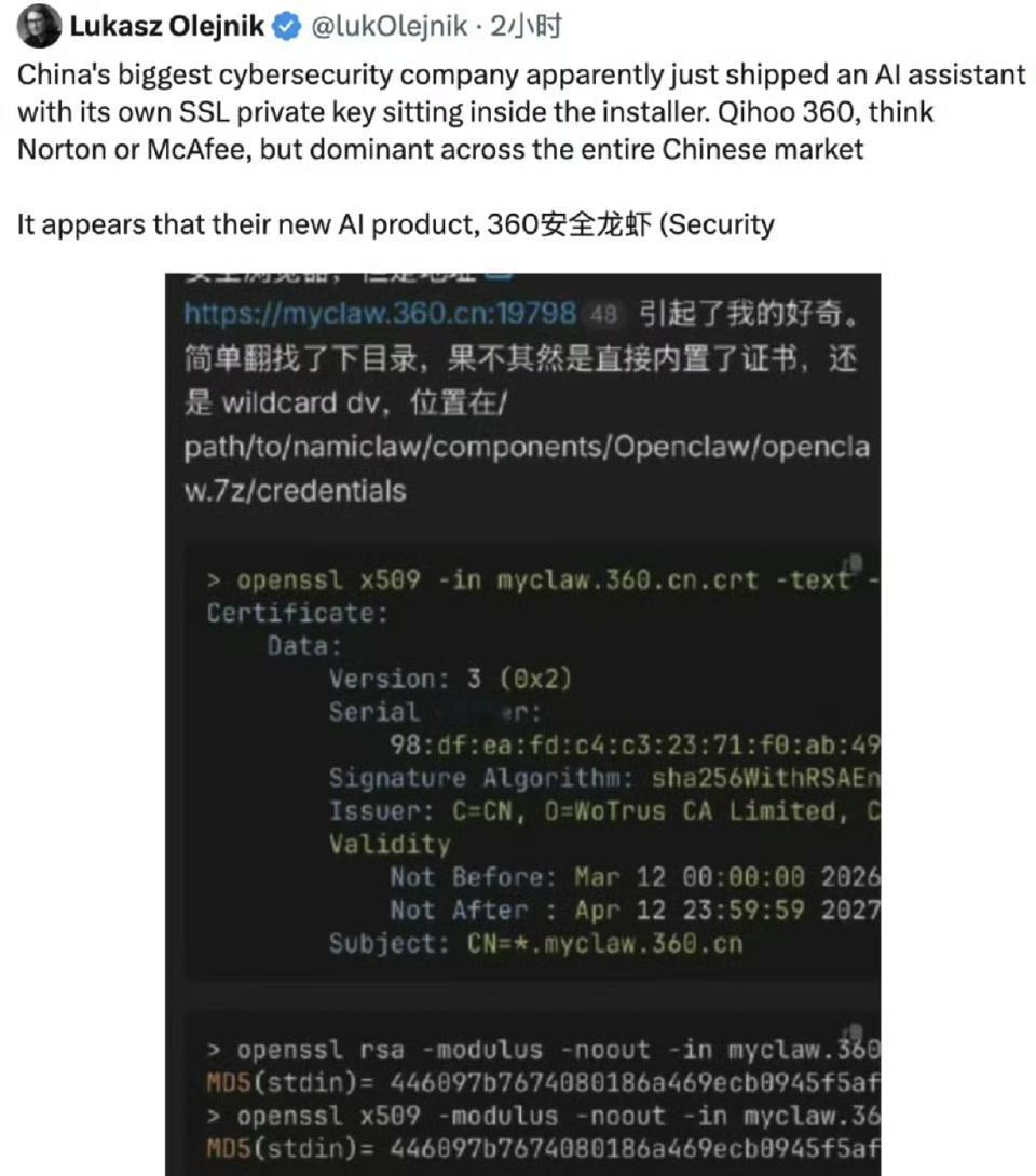 都说“养龙虾”不安全,我还不信,这下一主流媒体曝光了360养龙虾的安全漏洞,这下实锤了? 360 安全龙虾泛域名私钥泄露,打进了安装包。今日安全社区网友发现,360 刚发布的 AI Agent 产品 "360安全龙虾"包含了泛域名证书的 SSL 私钥文件。简而言之就是,用户使用时可能被中间截获。 360作为以安全为核心卖点的公司,把自己的通配符证书私钥,打包进了面向公众分发的安装包里,导致用户信息泄露,这样做真的合适吗?