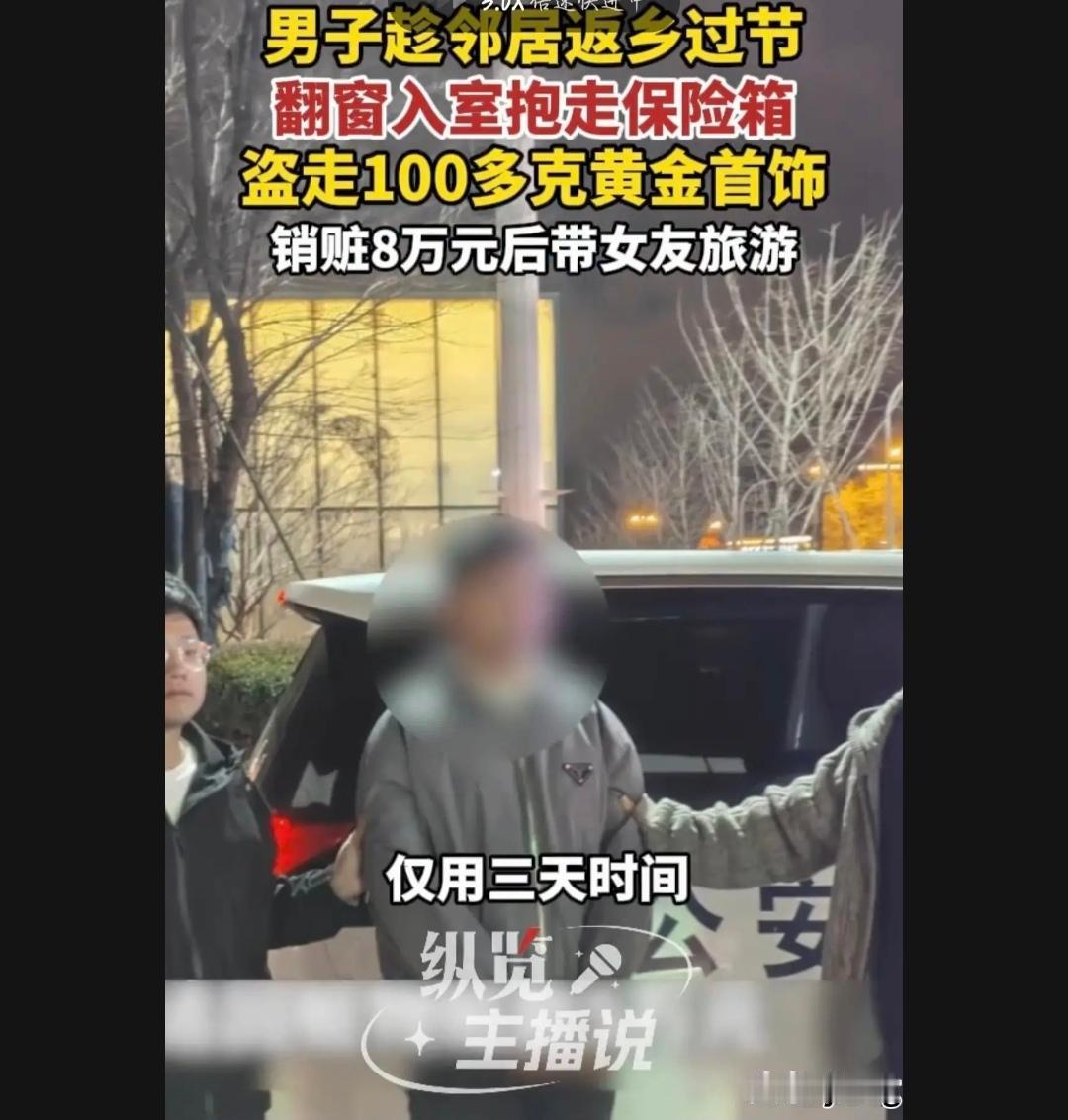 趁邻居过年不在家偷了对方100多克黄金带女友去旅游?浙江,一男子过完年回家,发现自己家里的保险箱竟然不见了!里面100多克的黄金啊!男子不敢犹豫,立刻报了警。民警接到报案后迅速展开调查,谁料,抓到人后才知道,那些黄金早就被换成8万元成了旅游的消费。 谁也想不到,这个胆大包天的小偷,不是流窜的惯犯,不是陌生的歹徒,而是平日里低头不见抬头见的邻居。 过年本是万家团圆、彼此祝福的日子,张先生放心出门,压根没提防过身边人。可他的邻居李某某,早就盯上了他家的保险箱。之前上门串门时,李某某一眼就留意到这个藏着贵重财物的箱子,一颗贪婪的种子就此埋下。 等到除夕家家户户忙着团圆,张先生举家外出,李某某觉得“天赐良机”,直接翻窗入室,干脆利落地把整个保险箱搬走。他没有半点犹豫、没有丝毫愧疚,砸开箱子看到金灿灿的首饰时,心里想的不是邻居多年的积蓄,不是做人的底线,而是立刻变现,及时享乐。 短短一天,100多克黄金变成8万元现金。这笔来路不正的钱,他一分没存、一分没用来改善生活,转头就带着女友奔赴千里之外的云南,住酒店、吃美食、看风景,把别人的血汗钱,当成自己浪漫旅行的经费。 他一边挥霍,一边沉浸在不劳而获的快感里,以为自己做得天衣无缝,能潇洒到底。可他忘了,法网恢恢,疏而不漏,凡是伸手,必有痕迹。 张先生回家看到空荡的房间,瞬间崩溃。这一百多克黄金,是他省吃俭用、辛苦打拼多年攒下的家底,是应急、是底气、是一家人的安全感。一夜之间化为乌有,换谁都难以接受。 警方接案后丝毫没有耽搁,顺着轨迹、消费记录、出行信息层层排查,只用三天就千里追凶,在云南将还在享乐的李某某当场抓获。 直到戴上手铐,这个被贪欲冲昏头脑的男人才如梦初醒。8万元已经被挥霍大半,最终只追回5万余元。他以为的浪漫旅行,最终变成牢狱之灾;他以为的一夜快活,要用自由、名声、前途来偿还。 更让人唏嘘的是,这起案件戳破了很多人不愿承认的真相:最可怕的不是陌生人的恶意,而是身边人的觊觎。 我们总觉得邻里和睦、熟人可靠,出门不用过度防备,钱财不必刻意遮掩。可人性最大的恶,就是见不得身边人好。你信任他,给他进出家门的机会;你无心展露的财物,在他眼里就是可以下手的肥肉。 一时贪念,一念之差,毁掉的是两段人生: 失主平白蒙受损失,安全感被彻底击碎,往后对任何人都要心存戒备; 小偷年纪轻轻,为了几天虚荣、一场虚假的浪漫,背上盗窃案底,牢狱之后,求职、生活、婚恋全受影响,一辈子抬不起头。 8万块钱,买得来几天风光,买不来心安理得;撑得起一场旅行,撑不起歪路人生。 这世上所有轻易得来的快乐,早已在暗中标好了价码。不劳而获的诱惑,从来都是陷阱;踩着别人的痛苦享乐,终究会自食恶果。 也给所有人提了醒:过年离家、长期外出,务必锁好门窗、妥善保管贵重物品。财不外露,是自保;防人之心,是底线。别用你的信任,去考验人性的贪婪;别给身边的恶,留下可乘之机。 伸手必被捉,贪心必翻车。踏踏实实赚钱,堂堂正正生活,比任何捷径都靠谱。 换成你,能想到小偷是邻居吗?评论区说说你的观点。浙江一男子偷邻居黄金带女友旅游 偷100多克黄金变现8万潇洒旅游