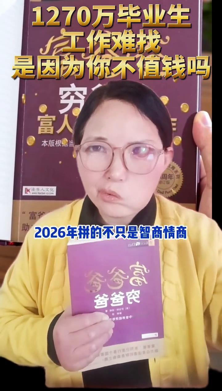 1270万毕业生工作难找是因为你不值钱吗? 报告说城镇新增就业1200万以上,但竞争依然惨烈。想变富先换思维,为什么你读了十几年书出来还是为钱发愁?富爸爸一巴掌打醒你。想变富先换思维,学校只教你怎么为钱工作,从来不教你怎么让钱为你工作。高学历的穷爸爸比比皆是,2026年拼的不只是智商、情商,更是财商。想变富先换思维,那个只会投简历的穷爸爸。 书在橱窗,点头像,今晚8点直播间来聊聊你的见解。富人不为钱工作。