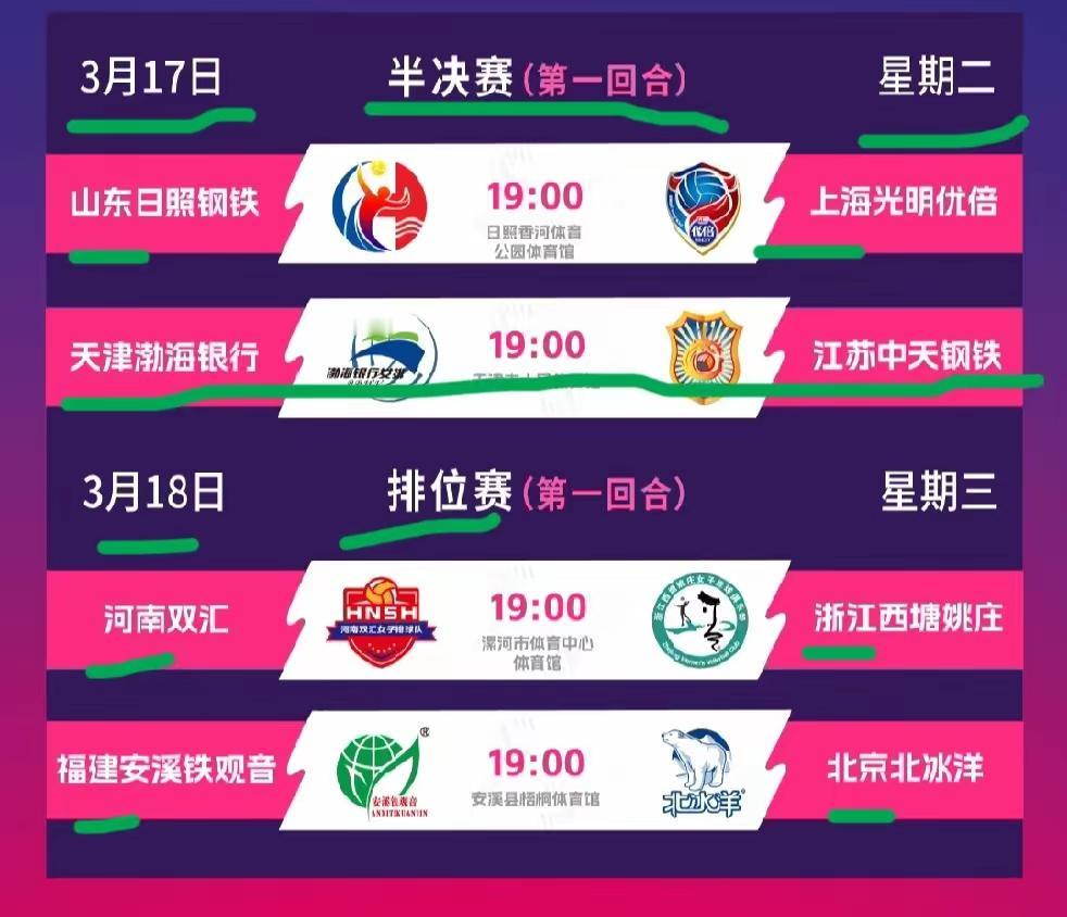 真刀真枪的半决赛和排位赛,无需算计,胜者为王! 天津渤海银行 常规赛第5轮主场3:1胜上海光明优倍 季后赛第5轮主场3:0胜上海光明优倍 上海光明优倍 常规赛第2轮客场3:0胜江苏中天钢铁 常规赛第9轮主场3:1胜江苏中天钢铁 江苏中天钢铁 常规赛第4轮主场3:2胜天津渤海银行 常规赛第11轮客场3:2胜天津渤海银行 如此连环套,江苏队胜天津队两场,天津队胜上海队两场,上海队胜天津队两场。 一场不夠,还得两场! 真刀真枪的半决赛,无需算计,胜者为王! 祝天津女排,上海女排,江苏女排好运!
