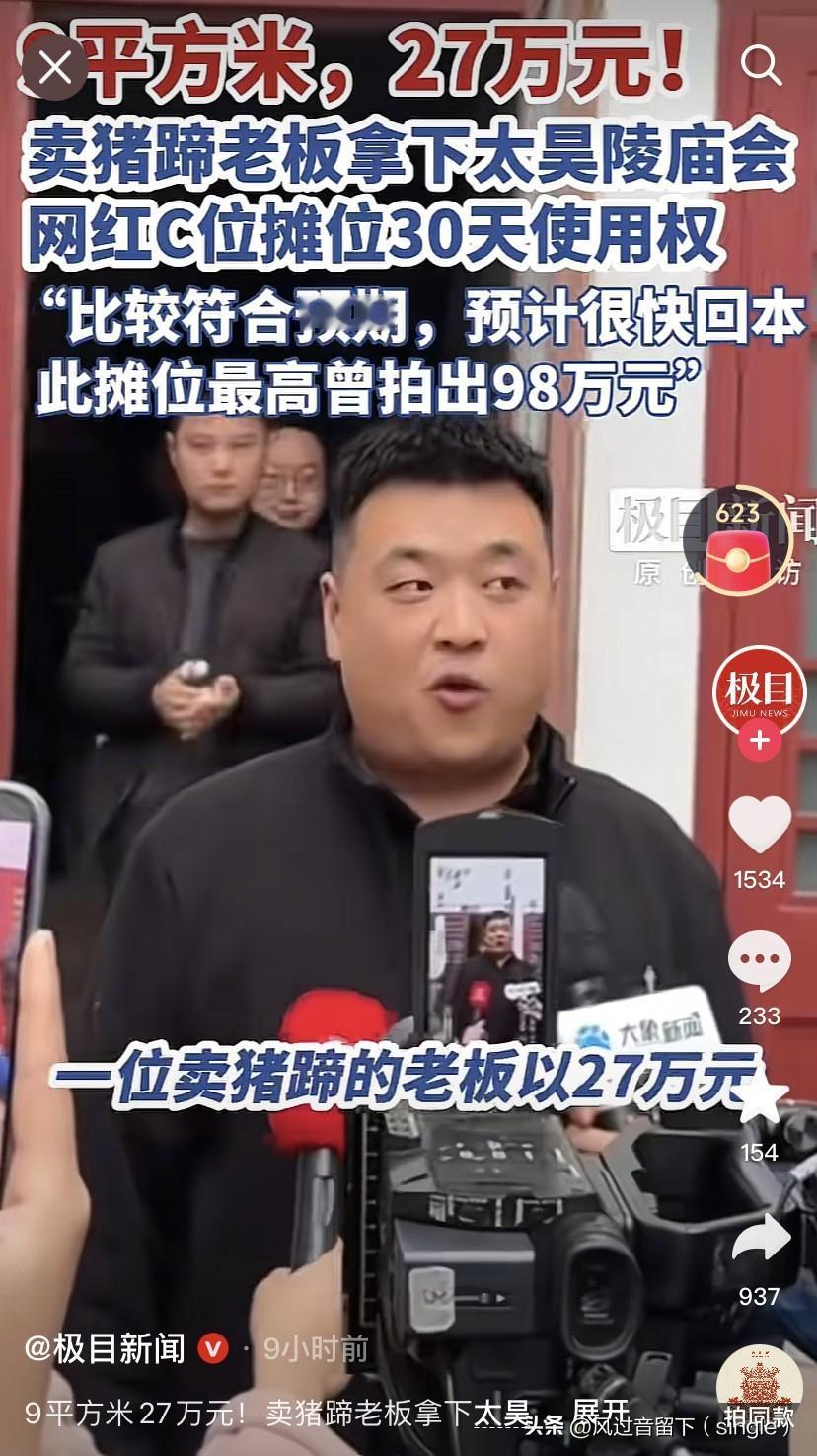 兄弟,你这风险冒得有点大啊! 周口太昊陵马上举办庙会,95后小伙以27万竞拍下周口太昊陵网红C位摊位30天使用权。 还说自己本来预算50万,没想到27万就拿下了,看样子自己好像赚了。 他在这个摊位上卖他自己创立的品牌美食——麻辣猪蹄,一个25块,预计每天营业额10多万。 还说这个摊位曾经最高拍出98万的价格。 我只能说兄弟,你这太冒险了! 第一,30天时间,虽然人很多,但是能挤到你这摊位跟前都已经把该买的都买了,你要保证一天的营业额在10多万,那一天最少得消耗4000个猪蹄,要是遇到刮风下雨天气,那估计很难消化4000个猪蹄。 去掉平均每天的摊位9000块,食材成本等等,根本挣不了多少。 第二,就怕你被人哄了,能拍到98万的摊位为啥能27万让你拿下?不要把任何人当傻子,其他人都看清了现在的经济现状,说明现在生意不好做,要是好做了,这个摊位就轮不上你,估计得100万,这就是差距。 估计其他人都看到了现在经济不行,赚不下钱,就很少有人竞争这个摊位,你这下27万拿下了,有点太冒险了! 要是在这挣钱了最好,不赔本还好,要是赔了,那就真的忙活了30天,啥也没落下。 所以投资需谨慎,不要认为自己捡了个便宜,万一是个坑呢!