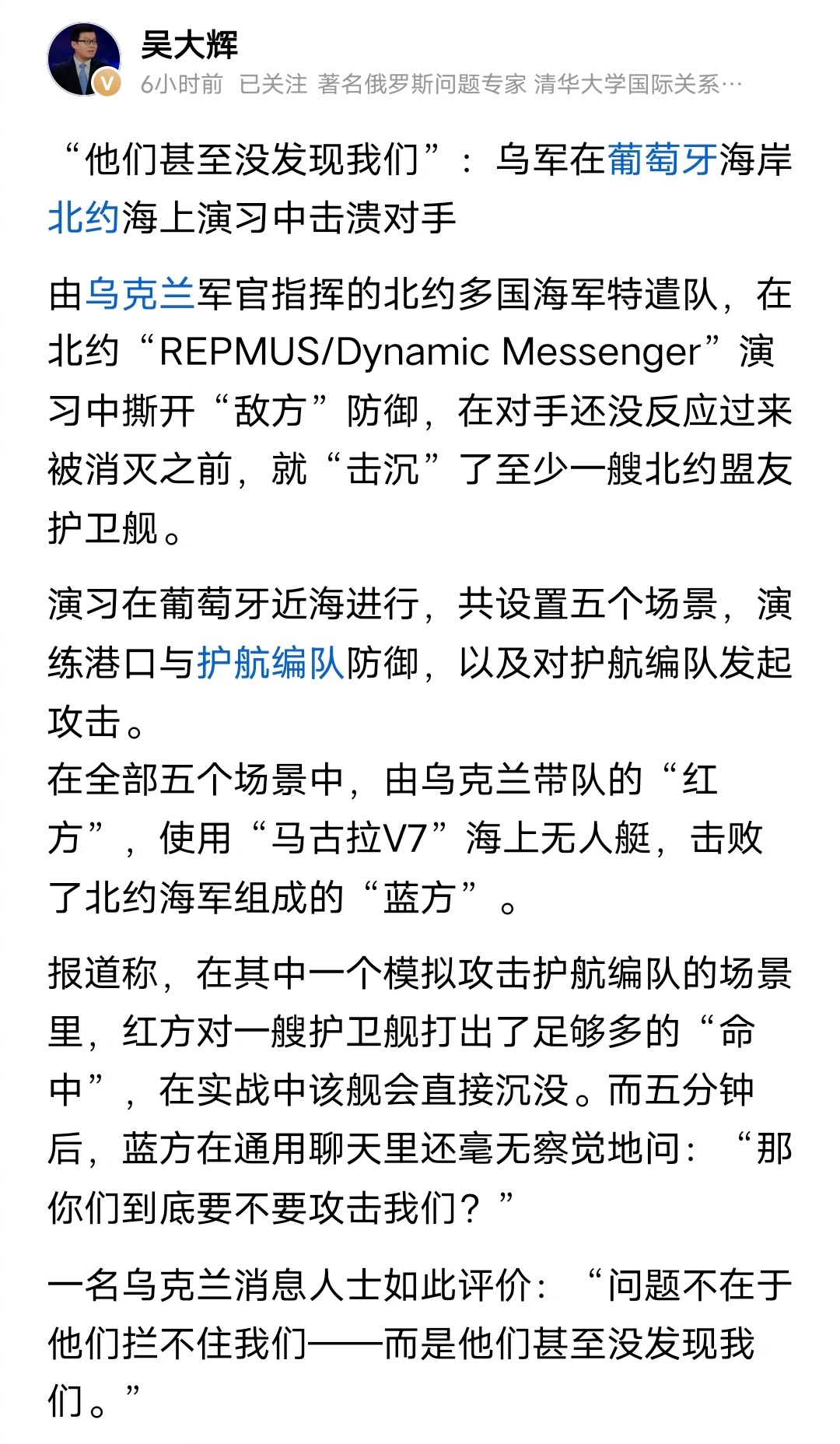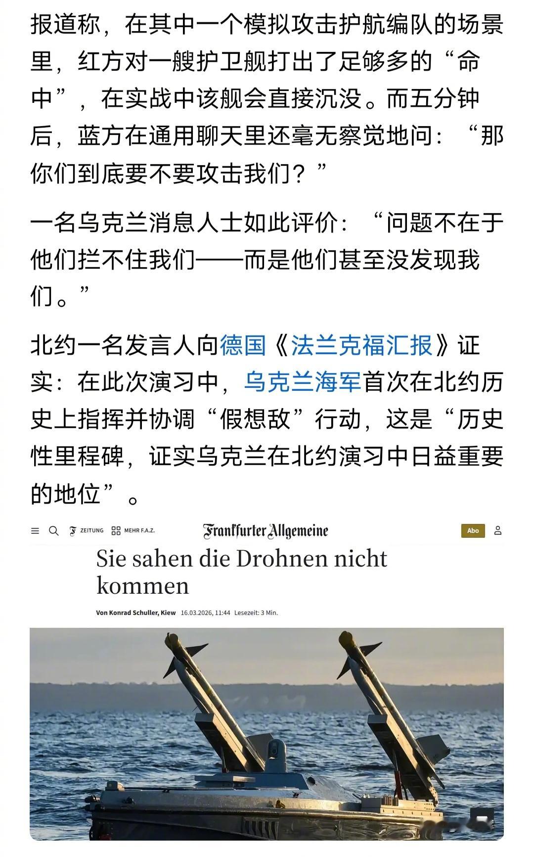 北约和乌克兰搞了一个海上军事演习,乌克兰的无人机已经模拟击沉北约的护卫舰了,北约的士兵还在傻乎乎地问:你们到底要不要攻击我们???