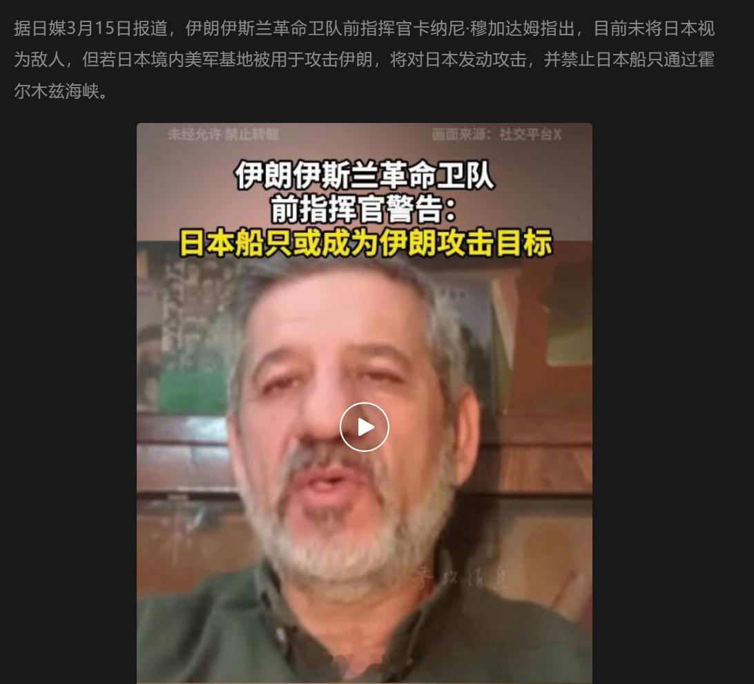 伊朗警告日本日本船只或成为伊朗攻击目标烽火问鼎计划 这次是真的要尊叫一声“朗哥”了!伊朗开始对日本出手了——如果日本境内的军事基地被用于攻击伊朗,那么伊朗也将日本作为打击目标!牛啊牛啊,俄罗斯把作为一个大国,对美系前锋狗腿势力的进攻行为,各种雷都趟了一遍,给咱们当了一次老师。伊朗,则是把与美发生战争,对拥有美军基地的国家,该怎么对它们,也做了一个示范,又当了一个老师。老俄教咱要对宵小动手就不要等红绿灯不要舍不得下手,朗哥教咱们要打周边有美军基地的国家全都别放过,集结美军的时候不做声,战争开打了“乱放氨气”,它们就是同谋必须照打不误。现在,伊朗对日本出手,核心原因,还是美军第七舰队的的黎波里两栖战斗群,从日本起航赶往中东。不过这种威胁说了也白说……日本还能去把美军基地拦下来不成?美军一脚油门日本敢吱一声都算它牛皮!只不过,本身就是老川子故意讹诈日本的,现在伊朗这么一说再加码讹诈筹码,老美的讹诈优势更高了,高低得在3月19日高市早苗去美利国的时候大出血。而伊朗方面,如果真敢打日本油轮,肯定会获得沙漠里的武器……岸舰高超要不要,无人机电路板要不要,都给你补货!很多人都看多的黎波里两栖战斗群去进攻伊朗的哈尔克岛,不是,不要真被老川子这种毫无军事逻辑的人给框了!的黎波里打哈尔克岛,请问它怎么去?从霍尔木兹海峡飞过去吗?还是说把两栖战舰停阿拉伯海然后美军马陆游泳去登岛?整个波斯湾,现在老美就剩了一艘濒海战斗舰,其他军舰全溜号了,油轮喊护航都喊不回来,美军战舰都拒绝护航,不敢去霍尔木兹海峡。林肯号更是溜号到也门海岸躲起来了。它这个两栖群,拿天灵盖去过海峡么?海峡都过不去,打个锤子哈尔克岛。这就是最后的讹诈演戏!