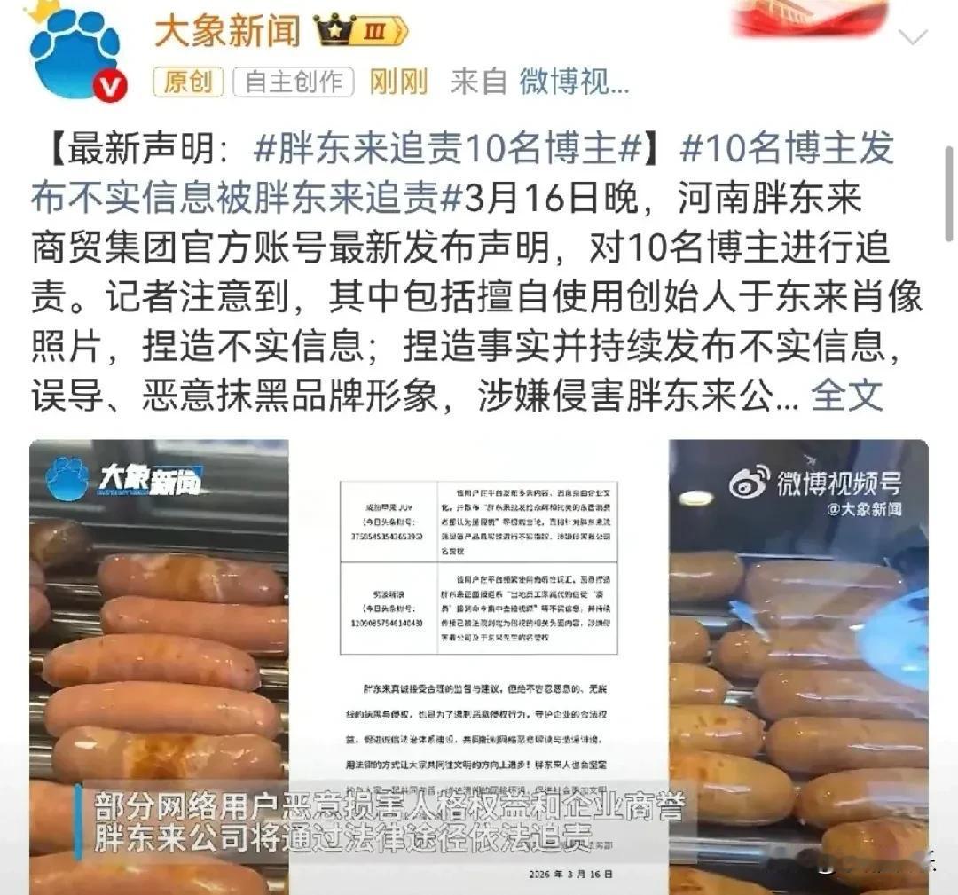 胖东来,太刚了! 3月16日深夜,当大多数人已经进入梦乡的时候,有个名字却突然冲上了热搜——胖东来。 这次可不是因为啥“神仙服务”或者“爆改同行”,而是因为它直接“掀桌子”了!官方账号深夜甩出一份声明,不仅没忍气吞声,还一口气把10个搞事的博主给“挂了”!这波操作,我只能说:又刚又硬,看得我直呼过瘾! 声明里写得明明白白,这10位博主大概干了两种“坏事”:一种是盗脸,一种是毁誉。 有的人擅自拿创始人于东来的肖像照片P图,然后就开始瞎编故事,为了流量连脸都不要了;有的人则是变着法儿地捏造事实,今天说“果汁藏猫腻”,明天造谣“代工贴牌货”,甚至用侮辱性词汇恶意抹黑胖东来的品牌形象。 胖东来在声明里也很刚,直接怼了回去:这些人是根本没搞懂我做企业的目的,在网络上对我们进行误读、恶意中伤,甚至是侮辱诽谤。 说实话,看惯了企业发那种“律师函警告”的套话,胖东来这次的操作简直是“降维打击”。 第一,取证动作快,姿态稳。它不是情绪化地跟网友对骂,而是直接甩出一份声明,告诉你:我们已经取证了,接下来法庭见。这就像打架前先把对方的手按住,让你动弹不得。 第二,打击面精准。这次点名,既有针对创始人的肖像侵权,又有针对产品的名誉侵权,覆盖面广,但刀刀见血。 第三,人设不崩,反而更稳。要知道,胖东来在老百姓心里一直是“良心企业”的代名词。这种平时笑眯眯服务,遇到诋毁直接掏法律武器的反差感,反而让大家觉得:这才是真性情,这才是真护短! 这件事看起来是在维权,实际上是在给整个行业立规矩。 现在有些人,手里握着几万粉丝,就觉得自己是“无冕之王”,随便拿张照片、编段文案就能给企业定罪。但胖东来这次明确告诉了所有人:舆论监督不等于造谣抹黑,想蹭流量可以,但别想踩着我的肩膀砸我的锅。 所以,这次我给胖东来点个大大的赞。它不是脾气大,而是骨头硬。希望这10位博主能明白:互联网的记忆,可是很长的。