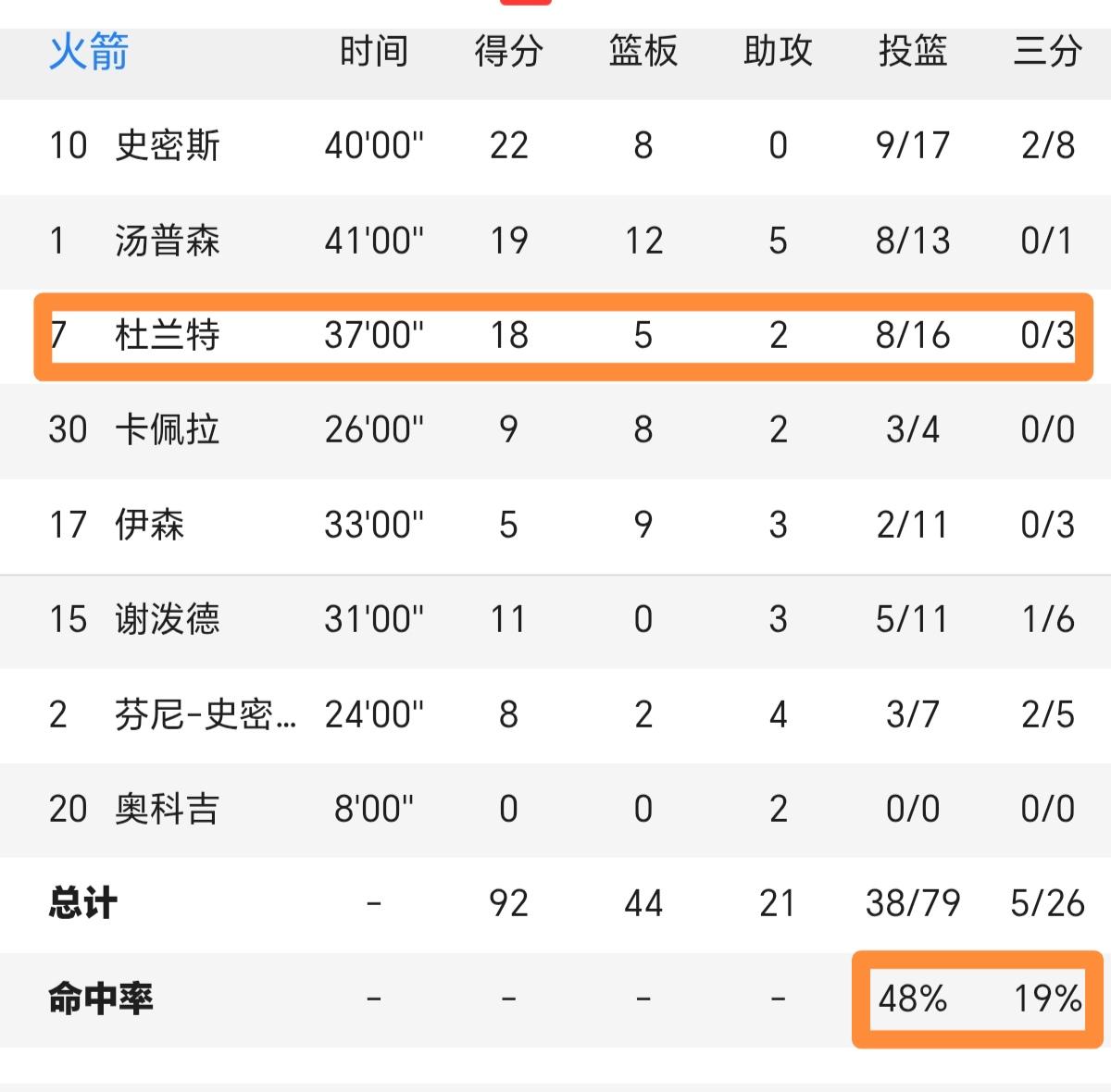 奇迹啊!湖人队三分命中率不足25%,居然在客场100-92带走了胜利。 此前,当三分命中率低于25%时,湖人基本输球。今天客场战胜火箭,湖人喜获六连胜,并进一步巩固了西部第三的位置。 东契奇依然强势,27投14中,爆砍全场最高的36分;詹姆斯发挥稳健,高效,13次出手,命中7球,拿到18分5板5助,是球队赢球的主要功臣。 杜兰特今天在场上的状态不是很兴奋,全场只有16次出手,命中8球,三分3中0,仅得18分。 主力控卫范弗里特赛季报销,主力中锋申京也因伤缺席,今天残阵迎战湖人的火箭,三分命中率只有19%! 杜兰特是心有余而力不足啊,输球也在情理之中。