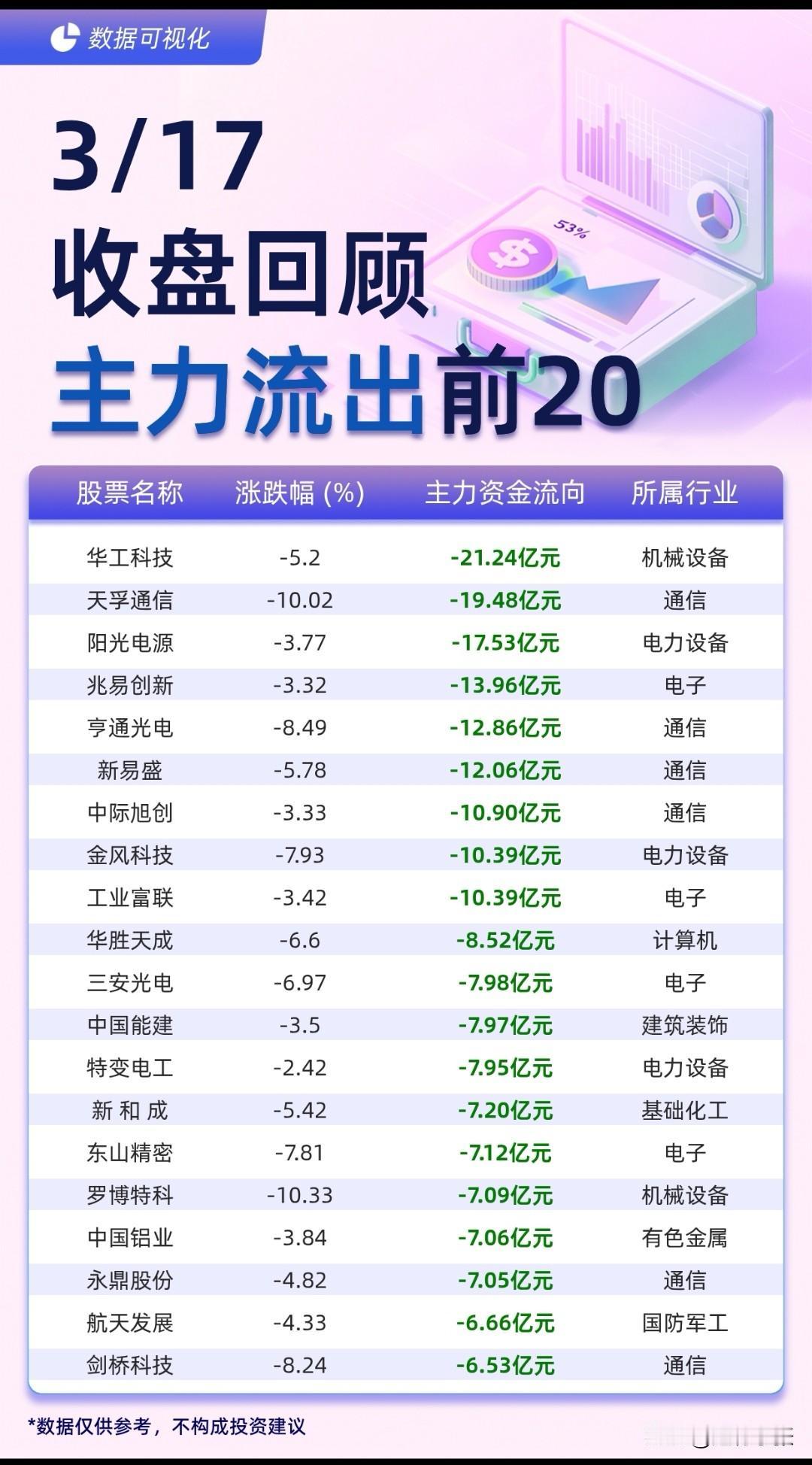 3月17日收盘资金动向复盘: 电力设备、汽车及金融板块获主力青睐,协鑫集成、山子高科分别获近20亿、13亿资金净流入,券商与银行股同步获资金加仓。 另一边,通信、电子及电力设备板块遭主力出逃,华工科技、天孚通信单股净流出超19亿,市场风格切换明显,资金高低位切换特征突出。 数据仅供参考,不构成投资建议。股市有风险,决策需谨慎。