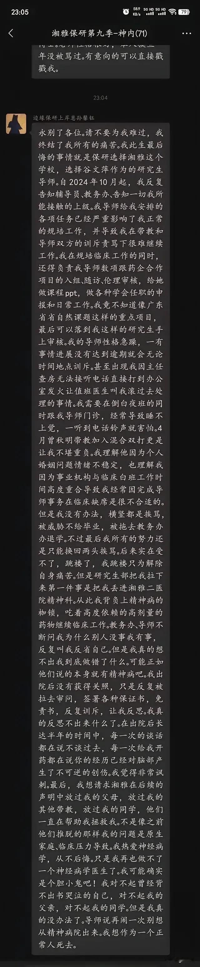 没想到 这个女孩用这样的方式 来教训那个恶毒的导师,可是一个也鲜活的生命就这样没有了! 学术压榨,威权压榨,精神压榨,各种各样的盘剥压榨,年轻人想有所作为真的是太艰难了。 一个鲜花一样的女孩子,就这样被无情的逼到了绝路,谁来为年轻生命的逝去负责? 我家邻居的孩子,目前也是读研究生,也是被导师各种压榨,每天9点到校,晚上11点下班,最近还说要给工位上放监控!哎,现在的孩子也苦呀!