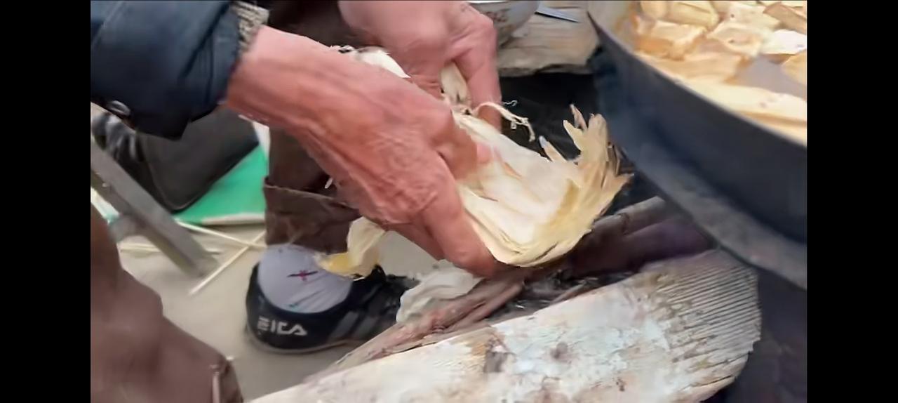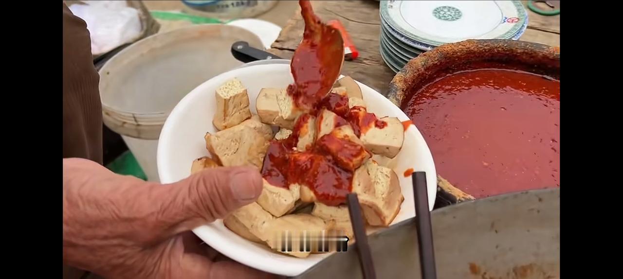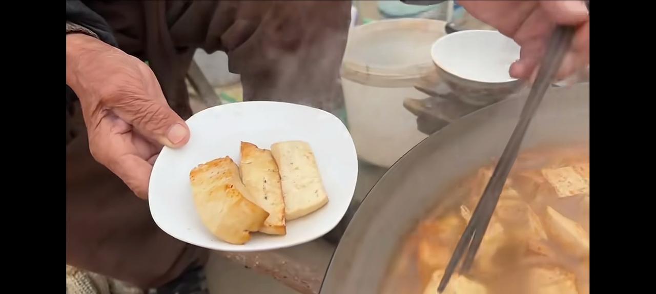 山东邹城,传统美食熏豆腐。 老大爷介绍说,从孔子那会就有这种食品了。传了几千年了。大爷弄了三大锅,100多斤。来赶传统的集会。因为豆腐是用锯末熏的,所以取名为熏豆腐。一锅熬上20分钟。出锅后,1块钱三片,大爷再用刀子切成小块儿。放上辣椒酱,那个好吃劲,您就甭提了。其实我也没吃过。不过一位大叔介绍,曾经有人一顿吃了18斤,一顿!这个好吃,您就可想而知了。 旁边有专门卖酒的,一大杯2块钱。小酒配熏豆腐,简直是人间美味。 大爷86岁,网友问他什么时候退休?他说农村人,有什么退休不退休? 忽然从大爷身上学到一种东西,活着就是一种快乐。