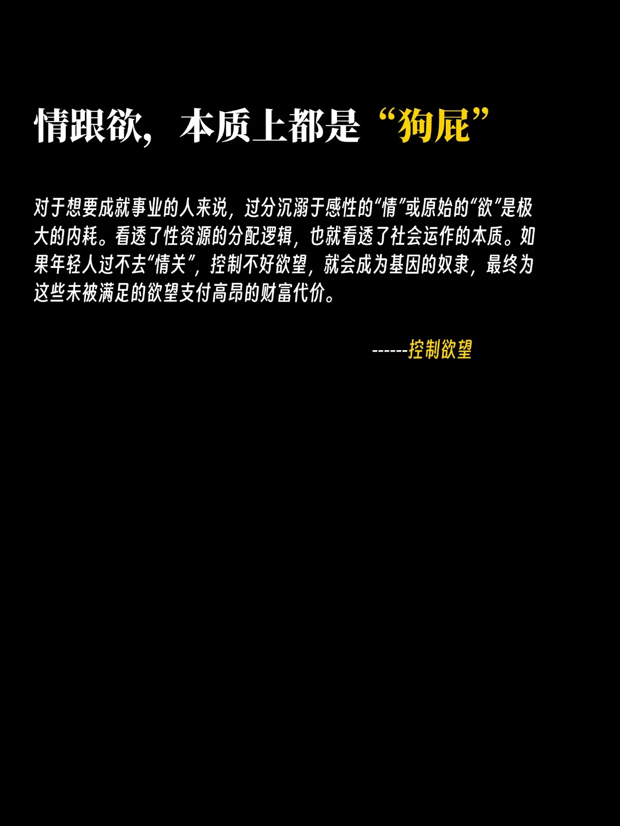 1、父母的性观念,直接影响你的财富等级。 2、情跟欲,本质上都是“狗屁”。 3、社会是一种等价资源交换,美貌也是商业筹码。