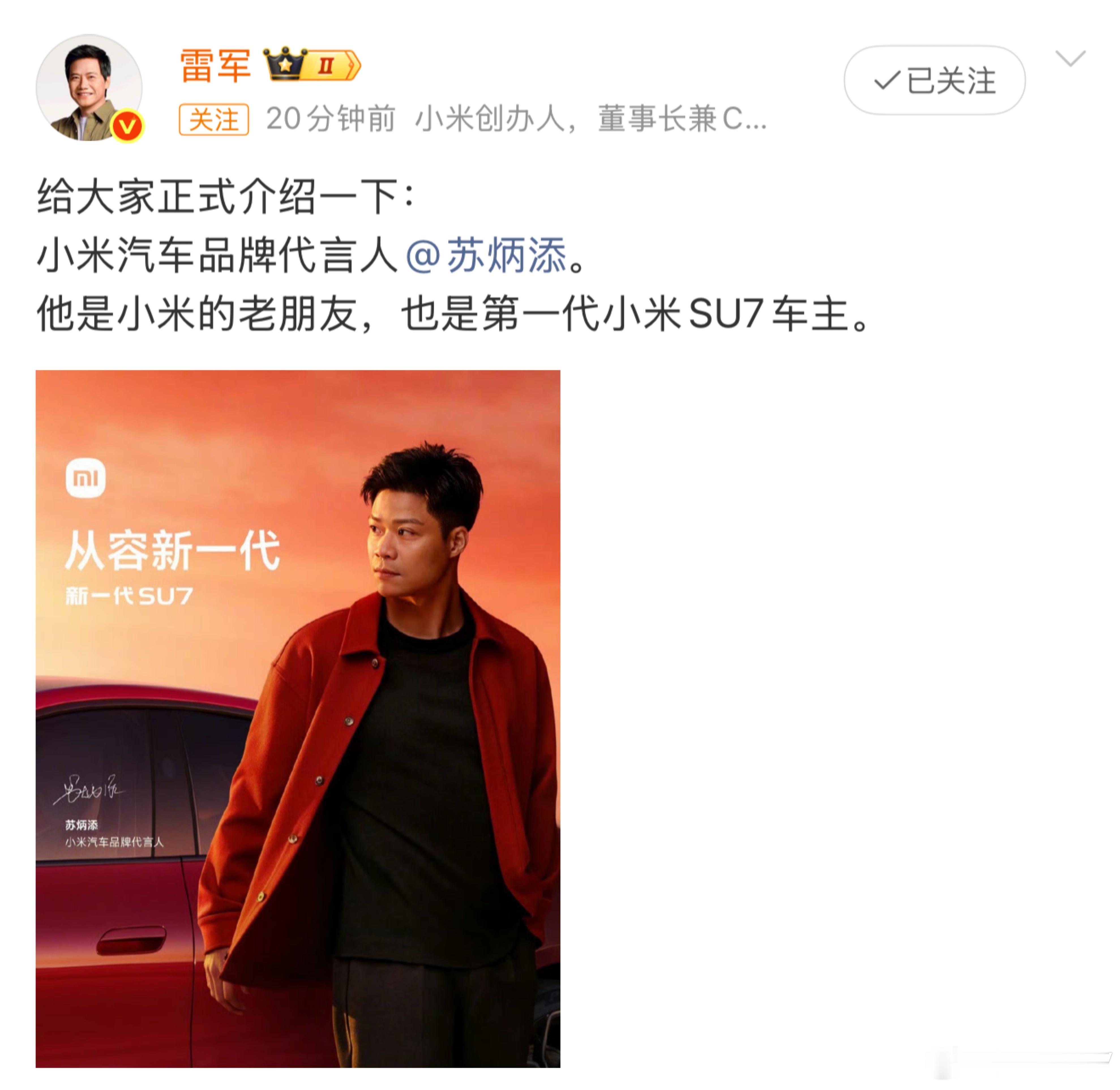 就在今天,小米汽车官宣苏炳添成为品牌代言人,很多网友评价称小米汽车请实打实的体育界顶梁柱比那些流量明星好得多,而且苏炳添还是小米SU7 Max真实车主,这样更有说服力。有人可能会说小米之前说过不找明星代言,在我看来,小米汽车这是找自己的车主代言而已,没有毛病,苏炳添作为亚洲记录的保持者、田协会长和真实车主,这个分量绝对够,只能说真诚是永远的必杀技,这一次新一代小米SU7又要大卖了。苏炳添官宣代言小米汽车