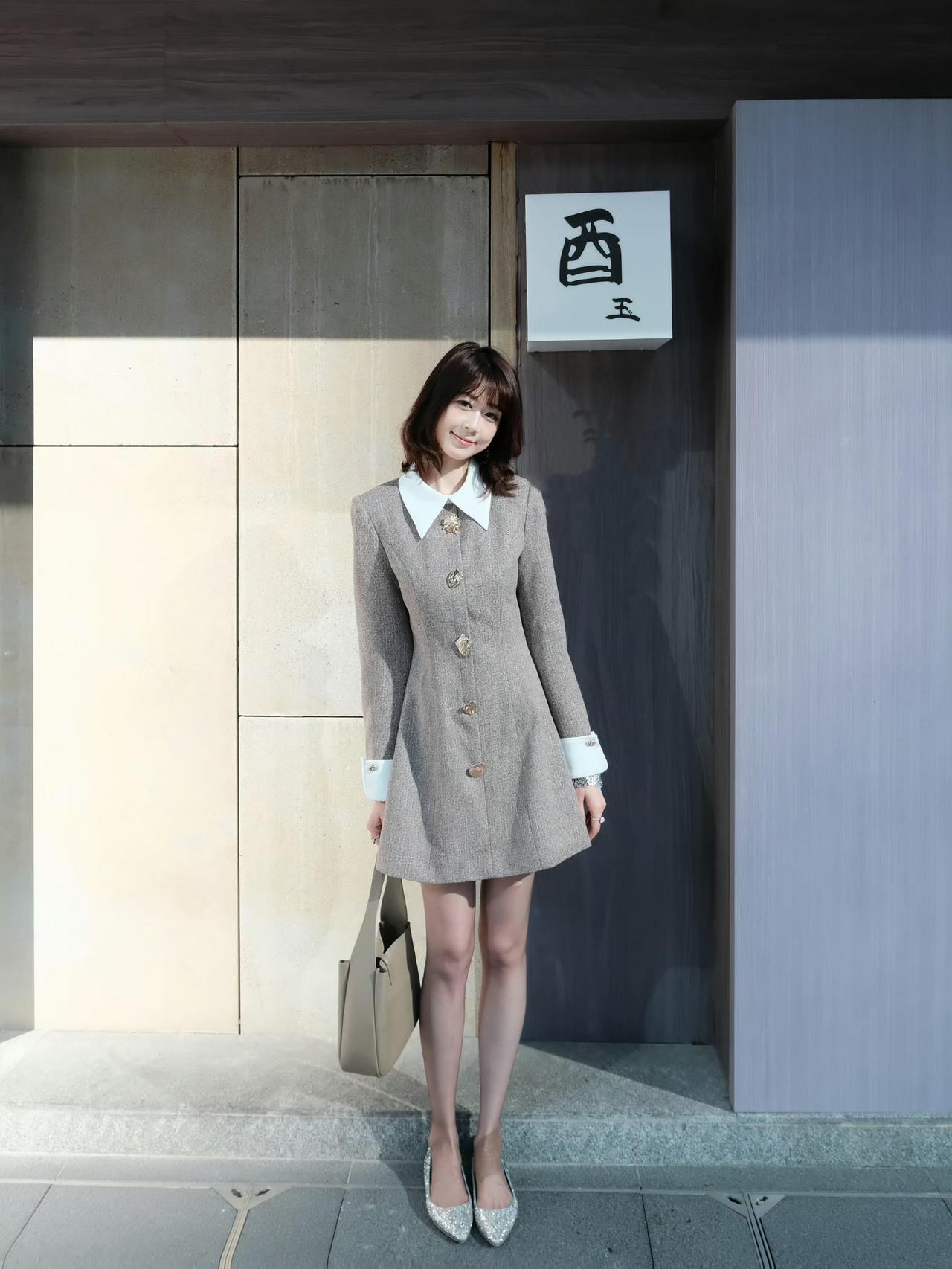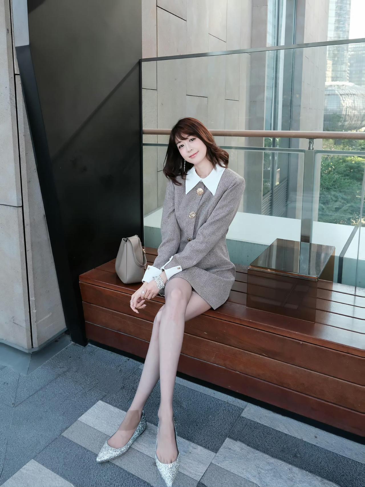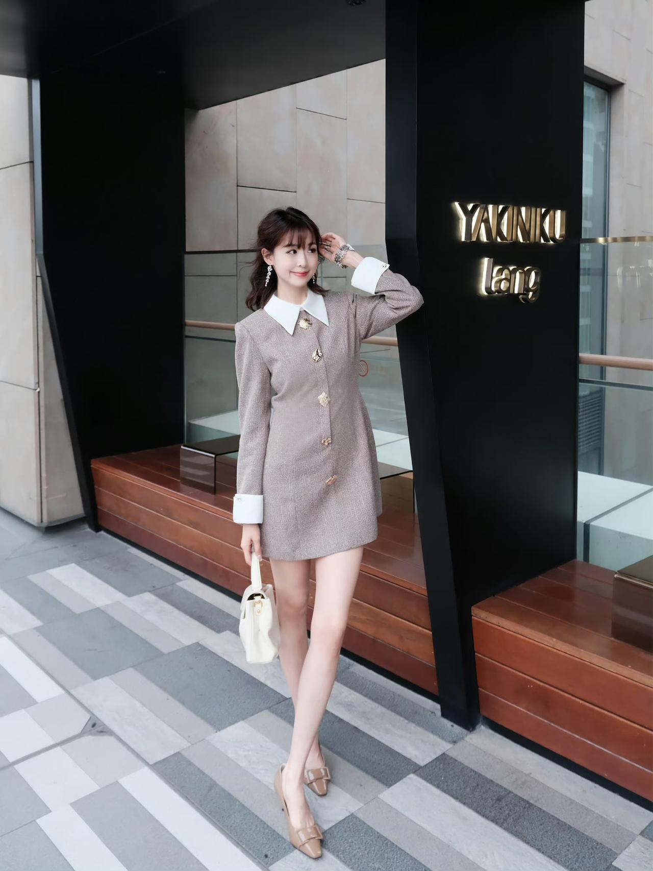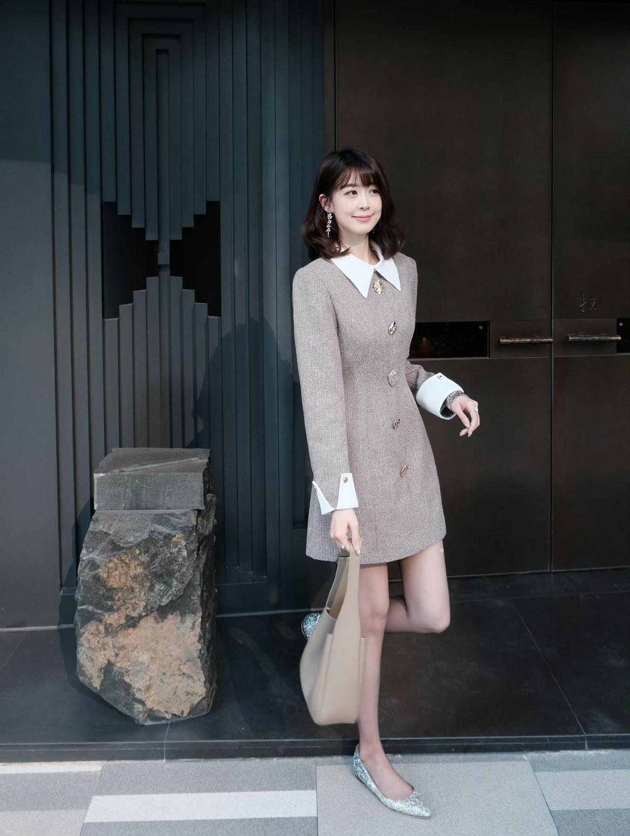 这套是清新学院优雅风,核心是浅棕撞白翻领连衣裙:宽翻领+撞色袖口自带学院清新感,金属扣装饰增加精致细节,浅肤色袜+闪钻单鞋强化了优雅氛围,搭配简约托特包,整体清新又精致。浅棕系穿搭照