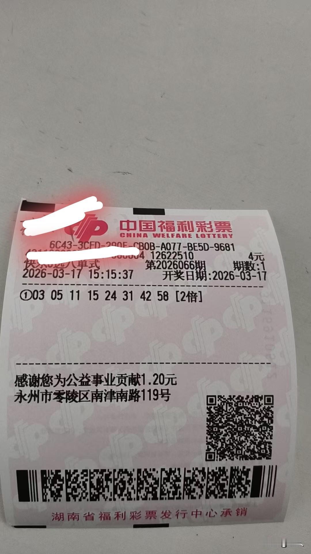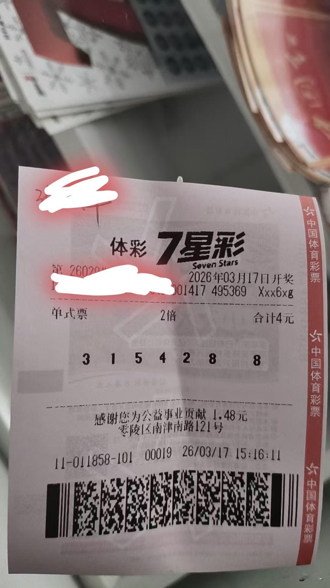 3月17日彩票打卡个人分享。体彩排列五第26062期(2026年3月13日)开出号码31542,全国中出3115注一等奖,单注10万元,四川一位彩民独中2970注,狂揽2.97亿元,直接清空奖池,全网火爆接好运。我也沾这波亿元喜气,用31542组七星彩,后两位加8、8,组成3154288,顺8发、马年旺财,借神号加持,愿好运连连、喜中大奖。`