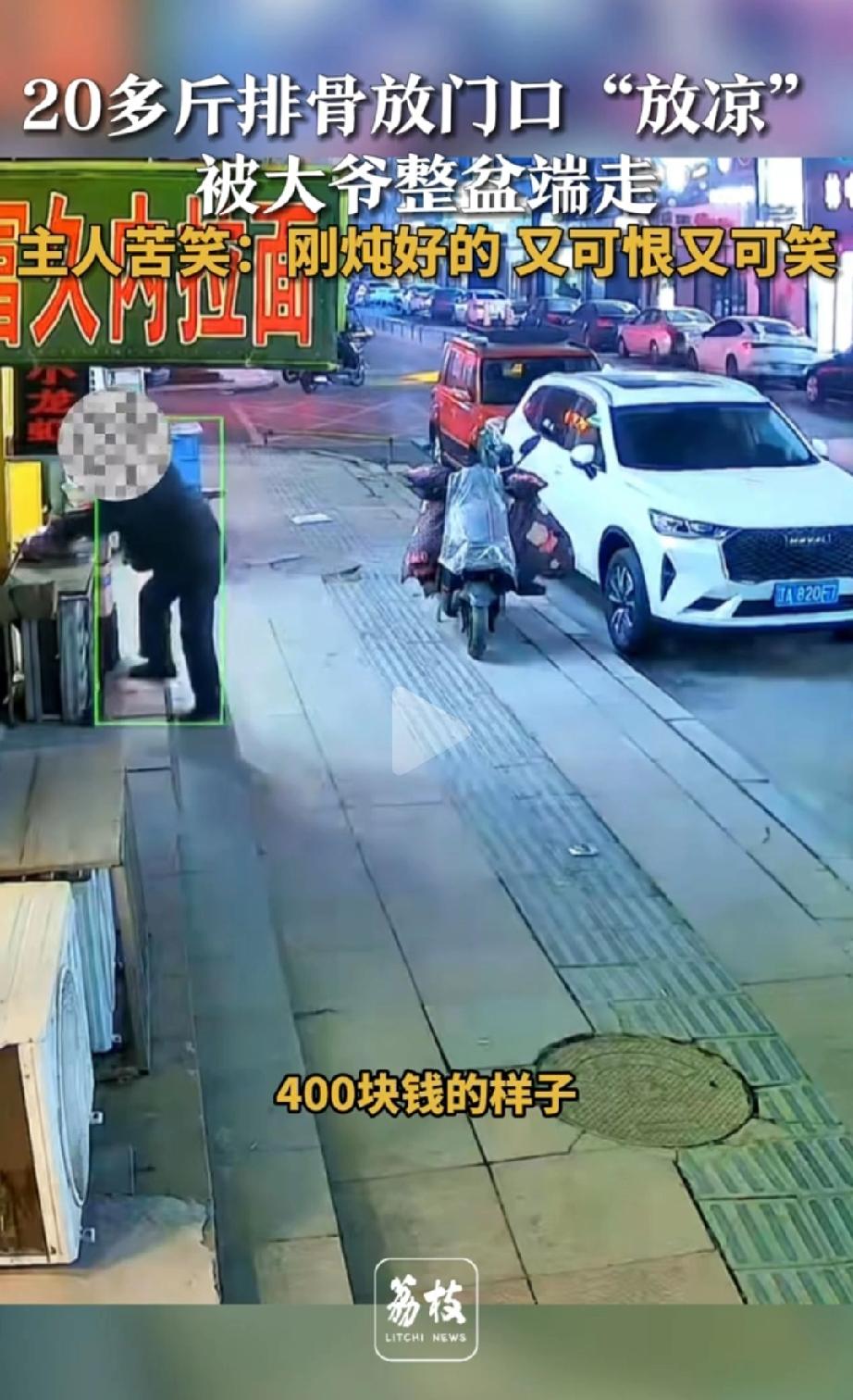 万万没有想到!辽宁,沈阳一家火锅鸡店,店主张女士把刚炖好的20斤排骨放门口晾凉,准备冷藏,万万没想到,被路过的大爷连盆带肉全端走。店主:刚多好的,又可恨又好笑! 张女士经营的一家火锅鸡店,当天店里进了40斤排骨,忙活半天用高压锅炖得香喷喷的。因为生意原因,最后剩下了20多斤没卖掉,大概值400块钱 。 由于排骨刚出锅太烫,没法直接放冰箱,张女士就顺手把这满满一盆排骨端到了店门口,想借着冷空气放凉了再收进来。 可谁能想到,就一个转身的功夫,张女士进屋可能也就是拿个东西、回个消息的功夫,等她再出来一看,好家伙,门口空空如也!那盆20斤的排骨,连盆带肉,凭空消失了! 她赶紧调出监控一看,真相让人哭笑不得。 画面里出现了一位大爷,戴着口罩,步伐那叫一个稳健 。只见他目标明确地走到店门口,弯下腰,抱起那个沉甸甸的盆,转身就走。 整个过程一气呵成,没有丝毫犹豫,也没有东张西望,那淡定的神态,仿佛就是在自己家端一盘水果一样自然 。 张女士看着监控,心里是又气又觉得可笑。气的是,自己辛苦炖了半天的排骨,准备当这几天的口粮呢,就这么没了;可笑的是,这位大爷这“不见外”的劲儿,实在是让人活久见。 目前,张女士已经报了警,警方也已介入调查 。毕竟一盆排骨价值400块钱,对于小本经营的餐馆来说,这可不是一笔能随便忽略的小钱。 有网友人替大爷说话:“是不是大爷以为这是店里不要的垃圾,或者放在门口没人要的东西,才捡走的?” 但很快被网友怼了回去:一盆热气腾腾、油光锃亮的排骨,整整齐齐放在盆里,谁家的垃圾长这样? 这逻辑,说白了就是揣着明白装糊涂。” 就如网友说的:不问自取就是偷,这么大一盆排骨,明摆着是店家的食材,怎么能说拿就拿! 咱们都知道,开个小餐馆有多不容易。起早贪黑,买菜备料,就为了赚点辛苦钱。400块钱的排骨,得卖多少份鸡才能挣回来?张女士那一声“又可恨又可笑”,听起来是调侃,但里面藏着多少无奈和心酸 。 可恨的是这种行为,可笑的是这种荒唐。 这位大爷可能觉得自己就是“顺手牵羊”占了个小便宜,甚至可能觉得“放在门口就是无主的”。但他没想过,这一盆排骨,是店主的生计,是人家明天的指望。这种所谓的“不见外”,其实就是对别人劳动成果最大的不尊重。 往小了说,这是贪小便宜,道德上有亏;往大了说,未经允许拿走别人价值400元的东西,这已经涉嫌违法了 。 对于店家来说,人心隔肚皮,哪怕是放凉这么一小会儿,门口的东西也得有人盯着,防人之心真的不可无 。 而对于我们每个人来说,无论什么时候,都要守住那条底线——不是自己的东西,手别伸。 目前警方已经介入,希望张女士能尽快找回自己的排骨,或者得到一个合理的赔偿。同时也想对那位大爷说一句:大爷,这排骨您端回家,吃得真的安心吗?