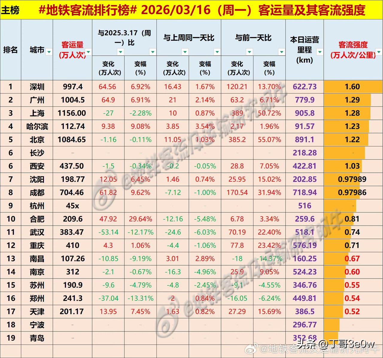 周一广州地铁客流量又过千万人次,达1004万多[呲牙][呲牙][呲牙] 爆料 身边事 排行榜 周一 广州 3月16日(星期一) 全国城市地铁客流量排行榜: 上海1156.0万 上海身边事 北京1084.65万 广州1004.50万 广州地铁 深圳997.40万 深圳身边事 成都704.46万 杭州452.0万杭州爆料 西安437.5万 西安地铁 重庆410.0万重庆地铁 武汉383.47万 南京310.0万南京爆料 长沙241万+长沙身边事 郑州241.30万郑州地铁 合肥209.60万 天津201.17万天津爆料 沈阳198.77万沈阳身边事 苏州190.90万苏州地铁 青岛112万+ 宁波112万+宁波爆料 哈尔滨112.74万 哈尔滨身边事 南昌107.26万