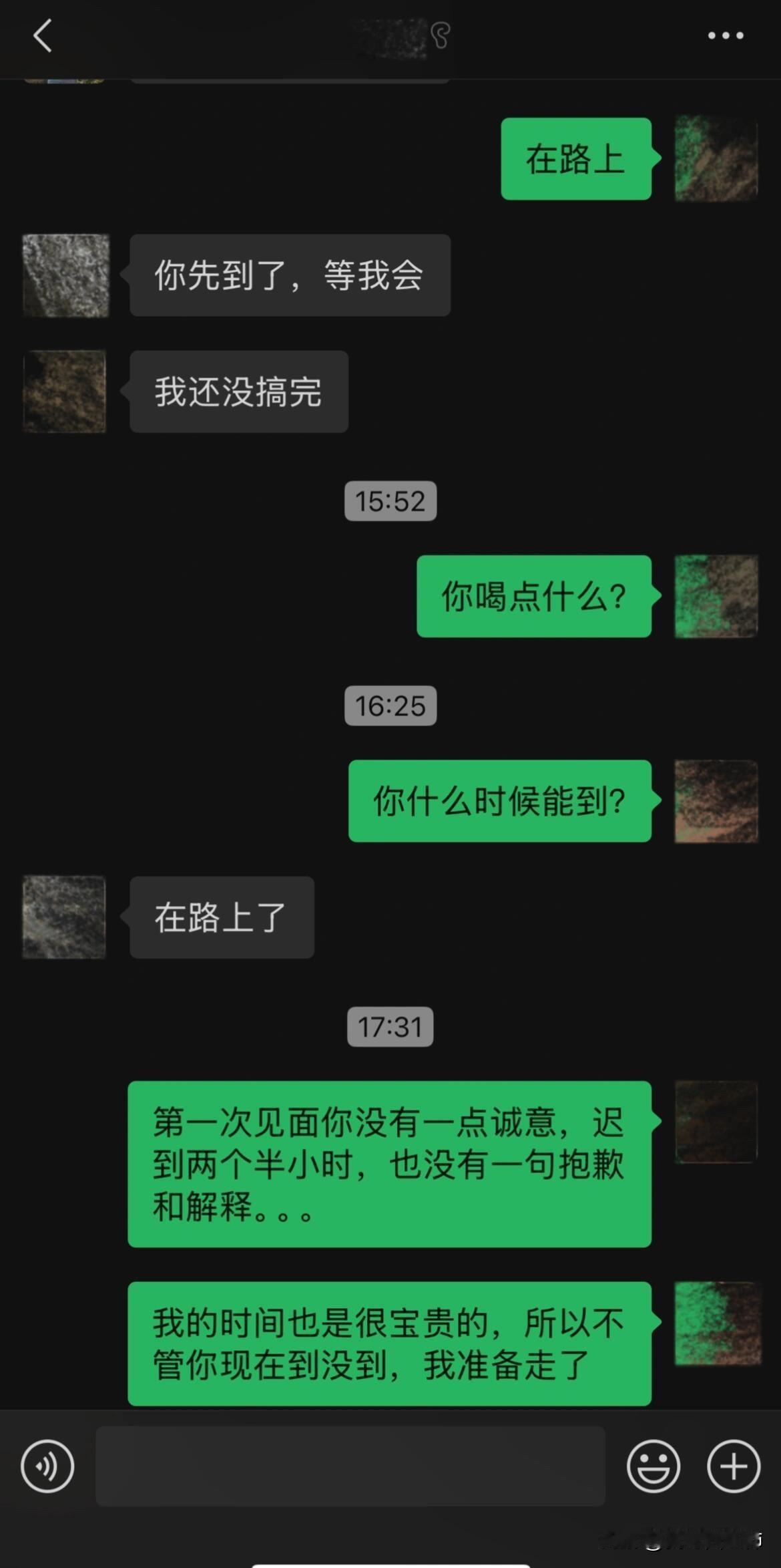 第一次见面对方迟到两个半小时 对方主动邀约第一次见面,时间地点都是对方定的,没有询问意见也没有折中找地方,而是找了个离我们都远的商场,本着不是什么大事的心态我同意了。 对方定的2点半,1点左右说要推迟到3点,我觉得问题不大,自己可以先逛一下。 谁知道这一等就是两个半小时。好家伙,时间管理忙不过来就直说,太多不合理的地方了,我都不想拆穿。也是让我见识到了人的多样性。