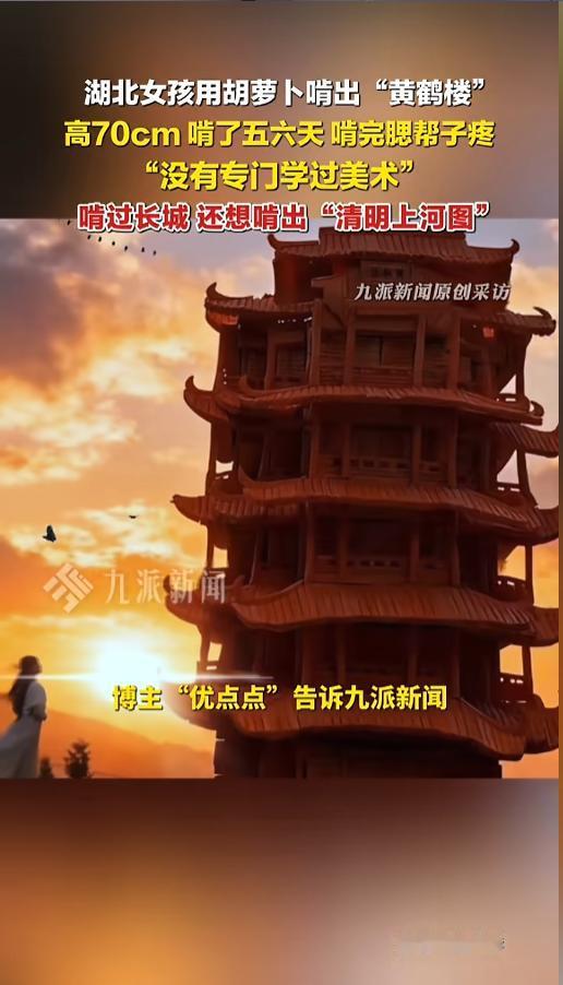 “玉兔精下凡?”近日,湖北恩施,一女孩用了五六天的时间,硬生生用嘴把一堆胡萝卜啃成了黄鹤楼的形状,看呆了一众网友。这座黄鹤楼有70厘米高,惟妙惟肖,全部由胡萝卜零件拼接而成。此前,女孩还啃出过凤冠、长城等作品。网友:这牙工真是一绝! 用刀雕刻食材,制成作品的见过不少,用牙啃的还真是第一次听说。不过,人家的牙工,可一点不输! 据媒体3月13日报道,女孩自己也没有专门学过美术,啃胡萝卜也只是个人爱好。刚开始的时候,主要啃一些小东西,像钥匙之类简单的物件。慢慢地,自己开始挑战高难度的。 她的大作品,都是采用了拼接的形式,先啃出一个个小零件,再把它们组装起来,此前,已经啃出过萝卜长城,还有镂空的凤冠。面具等。这次挑战了黄鹤楼,以后还想挑战清明上河图等作品。 黄鹤楼这个作品,花了她五六天的时间才啃出来。它有70厘米高,基本上还原了实物的样子,斗拱飞檐之类的,做的都非常逼真。 女孩坦言,每次啃完,腮帮子都会酸,嘴巴也会被胡萝卜上一圈色。这些胡萝卜也没有浪费,一般都是先放进水里保存。个头大一点的零件,去了皮的还能吃,不能吃的,就喂猪了。 网友看后表示,我用刀都切不出来,她就这么水灵灵的啃出来了?果然是天赋异禀啊!不行给这口牙上个保险吧! 信息来源;《3月13日报道,湖北恩施,