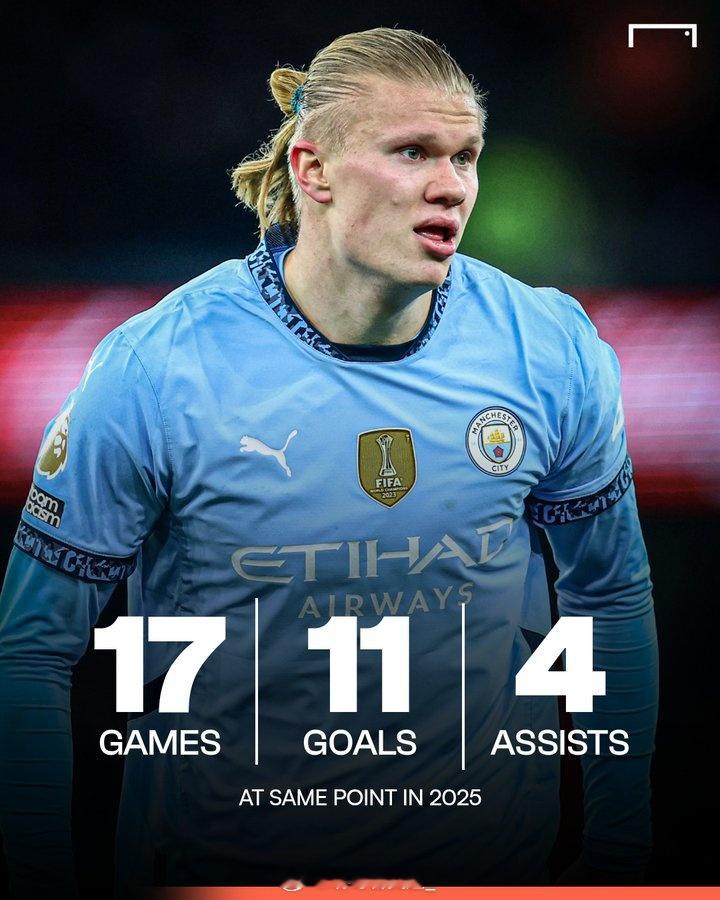 状态不佳!哈兰德2026年出战17场比赛,打进4球,助攻3次;2025年同期哈兰德17场11球4助。曼城vs皇马 哈兰德