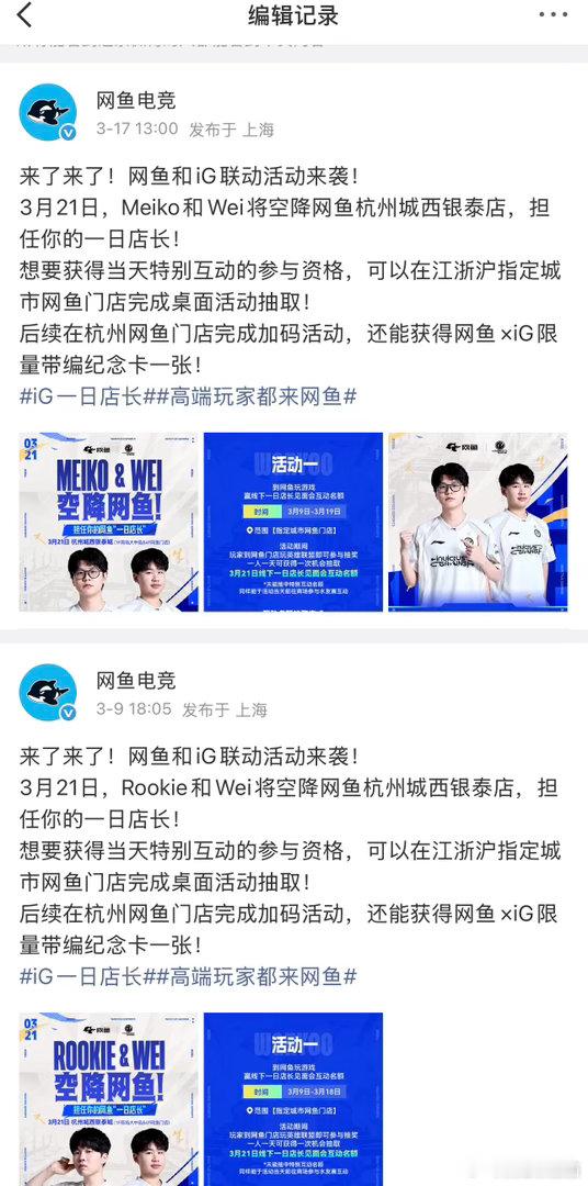 Rookie疑似被取消活动 Rookie遭遇分手风波取消原定线下活动,本来计划21号和Wei来杭州网咖当一日店长的,被临时替换为Meiko