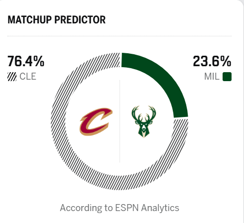 ESPN预测明日比赛:骑士胜率76.4%,雄鹿胜率23.6%