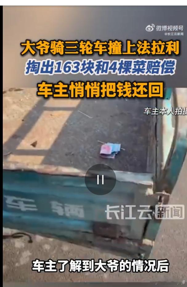 据车主介绍,大爷不知道车值多少钱,掏出了身上仅有的163元赔偿,知道真实车价后大爷又拿出了4棵橄榄菜……