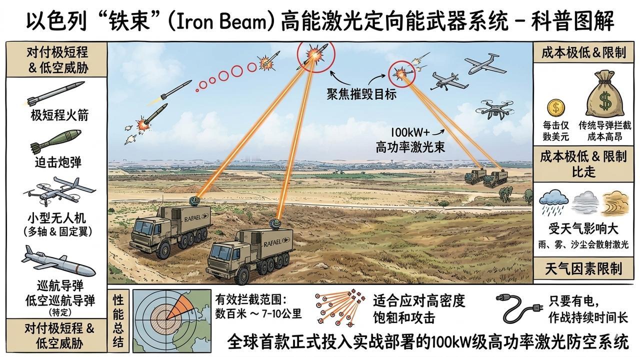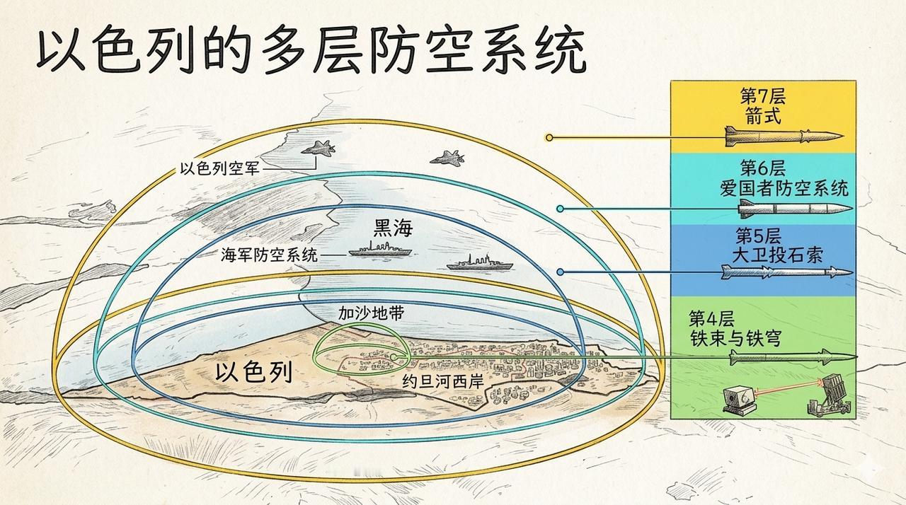 以色列拥有世界上最先进、最密集的多层防空反导体系。 核心由以色列自主开发的铁穹、大卫投石索和箭式系统构成,辅以美军支援的萨德、爱国者、新兴铁束激光武器、空军的战机拦截,以及电子战软杀伤能力。 这7层防御从远到近分别是: 在大气层外拦截远程导弹,甚至可以反卫星的箭3; 在高空中拦截中程导弹的箭2; 由美军部署的在中高空拦截中程导弹的萨德防导系统; 在中高空拦截中远程导弹和火箭弹的大卫投石索; 在中低空拦截飞机无人机和战术导弹的爱国者反导系统; 在低空拦截无人机火箭弹和迫击炮弹的铁穹防御系统; 近距离拦截无人机导弹火箭弹的铁束激光防御系统。 箭3的拦截高度可达数百公里,射程覆盖数千公里,能在威胁到达大气层前将其摧毁。实战中常用于应对伊朗远程导弹,是以色列战略级防御的核心。箭2是箭3的补充层,负责大气层内高空拦截(高度约50-100公里)。同样针对中远程弹道导弹,部署于2000年左右, 大卫投石索,主要拦截40-300公里范围内的巡航导弹、飞机、大型无人机和中程弹道导弹,高度约15公里,拦截弹速度可达7.5马赫以上。 最著名的“铁穹”,专拦截4-70公里内的短程火箭弹、迫击炮弹、火炮和无人机。每套系统含雷达、控制单元和发射器,自动判断威胁是否落入人口区,仅拦截必要目标。实战拦截率约90%,已部署多套覆盖全国。 铁束激光防御系统,其有效拦截范围通常在数百米至约7-10公里,具体取决于目标类型、激光功率、大气条件和系统版本。对付极短程火箭、无人机和低空威胁。相比导弹拦截,成本极低,每击仅数美元,适合高密度饱和攻击。