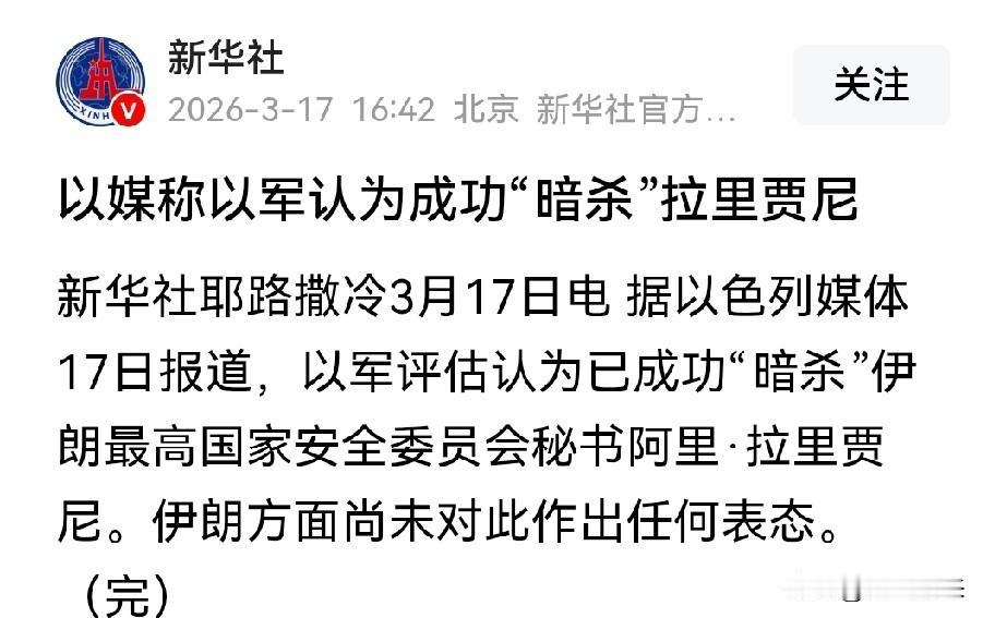 不得不说以色列确实厉害 又“斩首”伊朗高官阿里·拉里贾尼! 以色列媒体报道,以军评估认为已成功“暗杀”伊朗国家安全委员会秘书阿里…·拉里贾尼。 不过伊朗对此并没有给出明确答复! 如果消息属实的话,那伊朗就损失一员强硬派政要,对伊朗的士气也是很大的打击! 不过这种消息真真假假,假假真真! 也可能是以色列的烟雾弹,也可能确有其事! 伊朗还是要好好保护好伊朗这些高官政要,都是伊朗的宝贵资源和功臣!伊朗最高安全委员会秘书