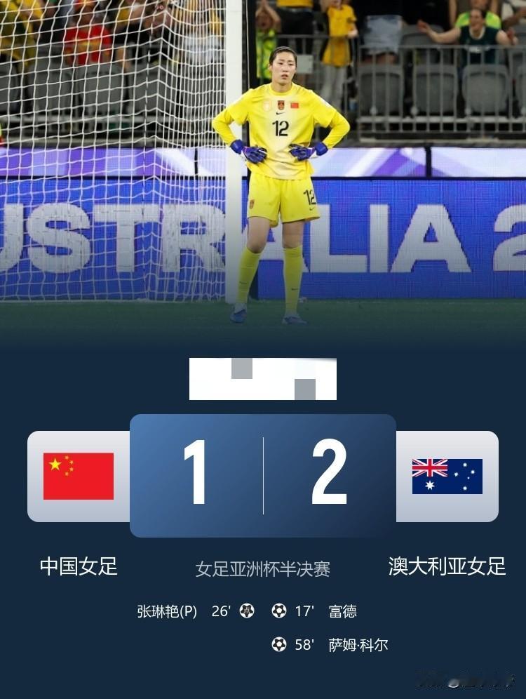 虽败犹荣,中国女足1-2惜败澳大利亚无缘亚洲杯决赛! 在刚刚进行的女足亚洲杯半决赛中,中国女足对阵强敌澳大利亚女足,此前中国女足已经连续12场比赛无法战胜澳大利亚女足了,再加上当家球星王霜停赛,因此今晚球迷也对女足能战胜澳大利亚没有报太大希望。 比赛过程女足一度让球迷看到了晋级决赛的希望,上半场澳大利亚女足率先破门取得领先,随后张琳艳利用澳大利亚女足后防失误造点并自己主罚点球1-1扳平比分。遗憾的是下半场女足进攻无力,防守却出现漏洞,门将出现失误,被澳大利亚打进反超比分得一球,最终中国女足1-2遗憾输给了澳大利亚,无缘亚洲杯决赛,也错失了卫冕的机会。 虽然中国女足输球无缘决赛,但是可以说虽败犹荣了,能踢成这样估计大伙都没想到,我们的机会比对面还多,只能说这一次运气不在我们这边了,能进入四强已经超出预期了。