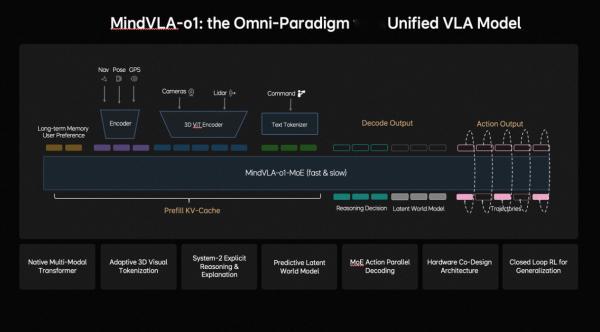 理想汽车发布下一代自动驾驶基础模型MindVLA-o1!理想汽车发布下一代自动驾驶基础模型MindVLA-o1,让自动驾驶看得更远、想得更深、行得更稳、进化更快、部署更高效;MindVLA-o1通过五大技术创新——3D空间理解、多模态思考、统一行为生成、闭环强化学习(Closed-loop RL)和软硬件协同设计(Hardware–Software Co-Design),构建面向物理世界智能的自动驾驶基础模型;理想汽车面向物理世界智能的核心AI框架包含统一的VLA数据引擎MindData,统一的原生多模态VLA模型MindVLA-o1,可控的多模态世界模型MindSim,以及强化学习基础设施RL Infra,该框架不仅服务于汽车,也可扩展至机器人及各种物理系统。车是最大号的机器人,理想汽车本质是在构建硅基生命体的躯干与大脑。理想L9理想汽车