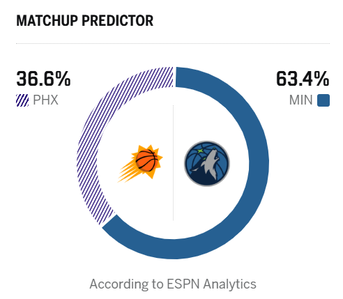 赛前,美媒ESPN预测本场比赛,森林狼胜率63.4%,太阳胜率36.6%。