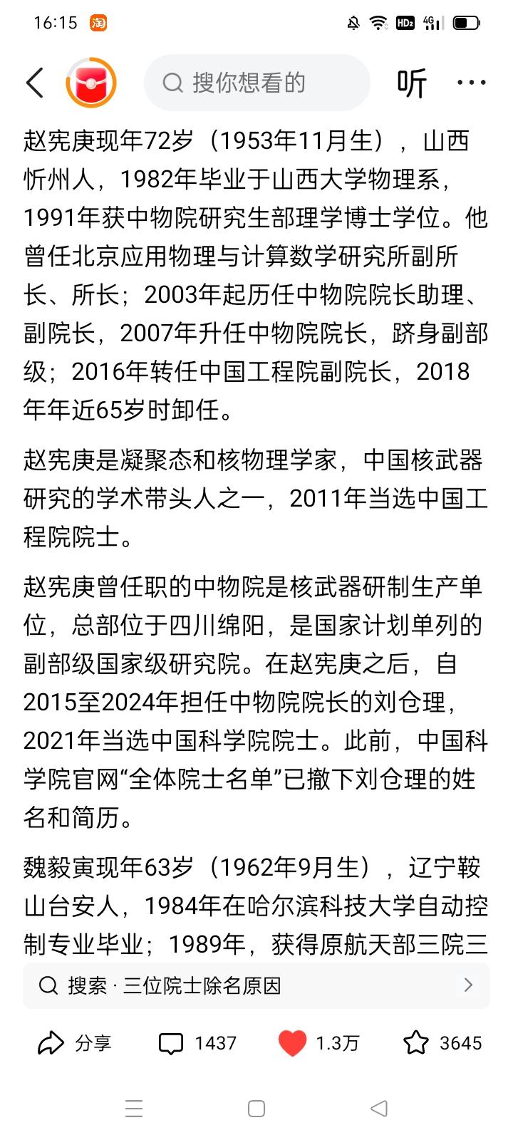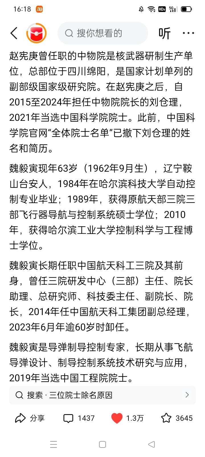 细思恐极!国防军工领域三个大人物落马 核武器 导弹及数字雷达领域的三个工程院院士同时落马了,真是令人触目惊心。 这三个大专家都在国防军工领域成绩斐然,并且功成名就,有的身居副部级高位,可以说功名富贵都有了。 可是他们竟然还不满足,还要违法乱纪,真是害国害己! 假如他们只是贪污钱财,他们应该还在国内,倒也罢了。 可怕的是,他们会不会被外国间谍拉拢腐蚀、而丧心病狂地出卖国家的国防科技核心机密?! 有时候,糖衣炮弹、声色犬马真的比真刀真枪还可怕! 这几个专家也六七十岁了,要那么多钱有什么用? 为了钱,就可以出卖祖国安全和人民的身家性命吗? 想一想邓稼先、钱学森、罗阳等等老一辈和近年来为了国家兴旺发达而呕心沥血的科技专家们,这些晚节不保的败类,还有脸 面对国家和人民吗?