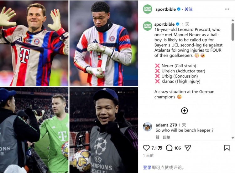 RMC:拜仁16岁门将普雷斯科特几周前担任球童,如今有望出战欧冠