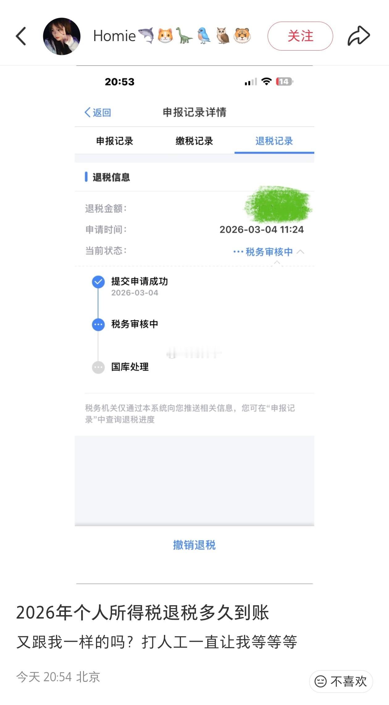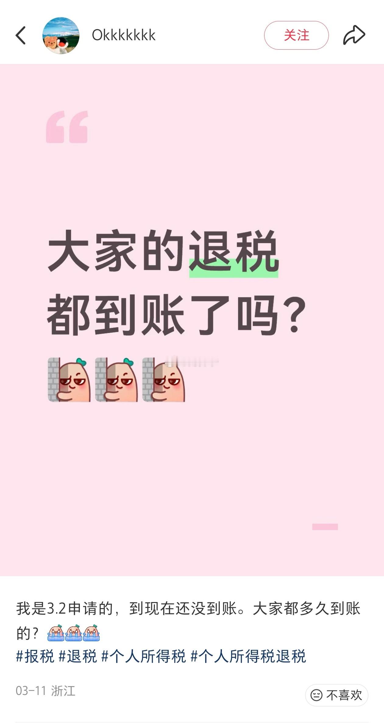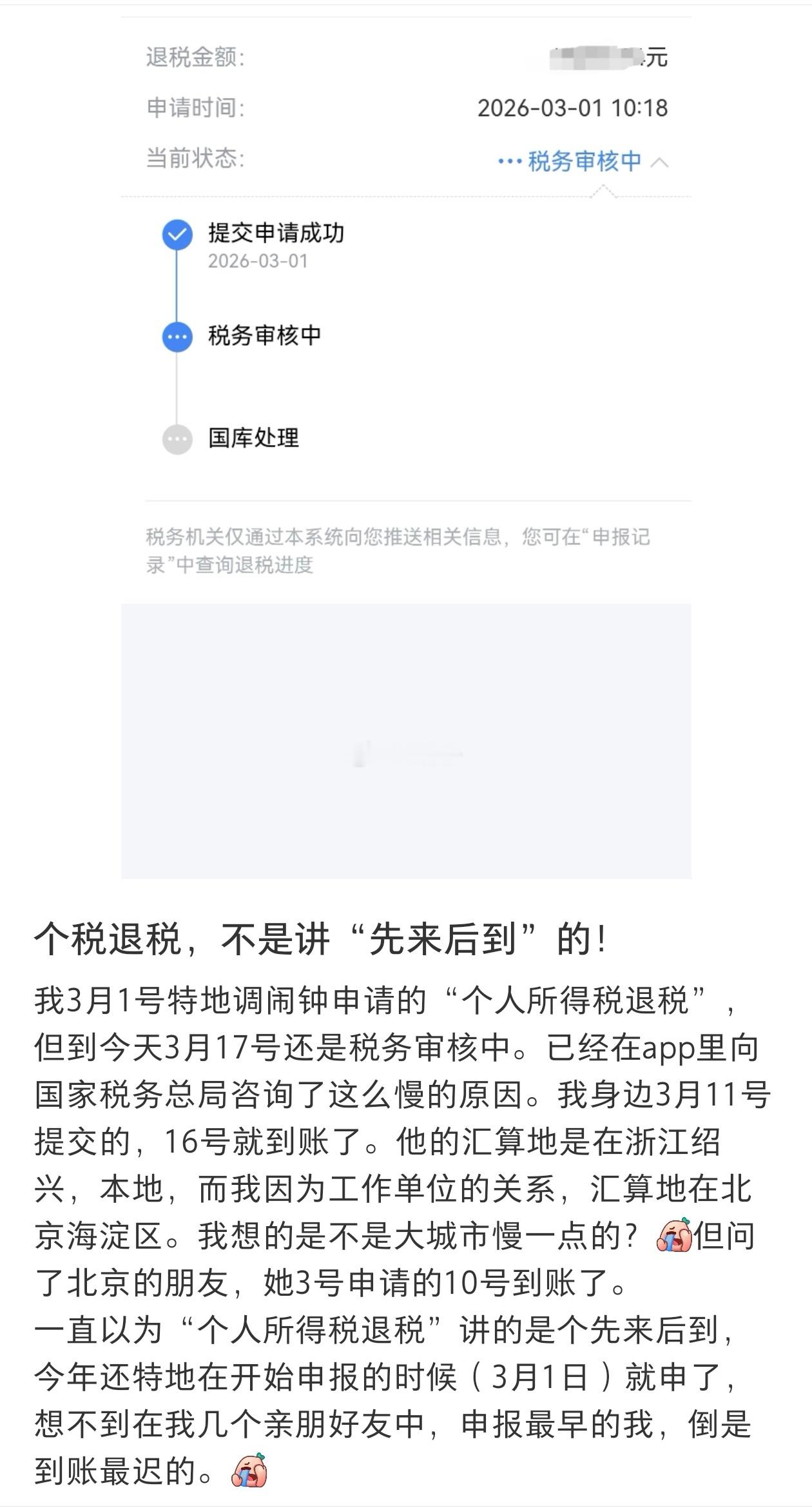 2025年度个人所得税退税,您到账了吗?“2025年度个人所得税退税”从3月1日正式申报开始,陆陆续续已经有很多网友称“到账了”。但是依然有部分网友说“没有到账”,而且一些网友甚至是在3月1日就申请了,但是一直到今天,十多个工作日过去了,还在“税务审核中”。有网友说:以为“个人所得税退税”是讲“先来后到”的——先申报,先到账。但没想到比他后申报的,都在五六个工作日后就到账了。他反而成了最迟到账的那一个。各位朋友们,你们的个人所得税退税,都到账了吗?