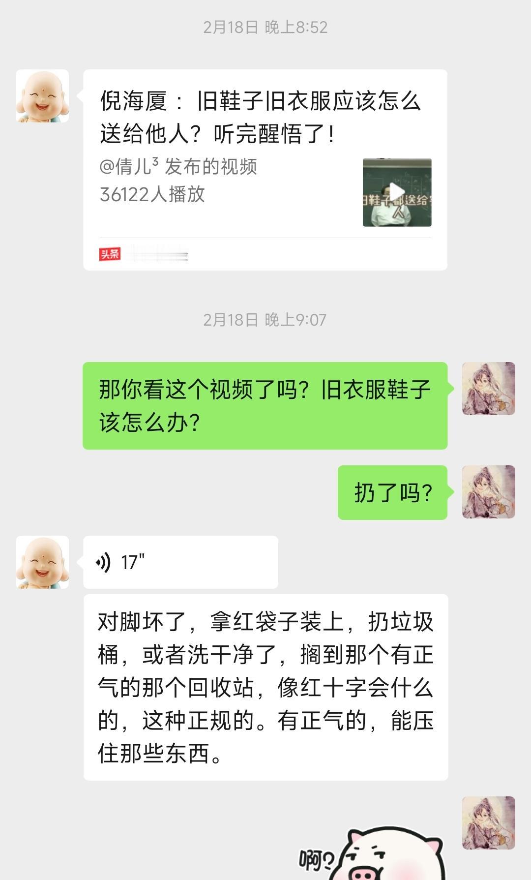 我都这么穷了,还怕别人吸走我的运气吗? 今天晚上断舍离了一些衣服,放到了垃圾桶旁边。 本来过完年回来,我就想收拾的。 但老公给我发了个视频,吓得我不敢扔衣服了。 他说别人如果穿了你的衣服,会把你的运气吸走的。 然后我就不知道该怎么办了。 扔也不是,留着又烦。 一大包旧衣服在阳台上放了好久,一堆衣服在沙发上放了好久。 每次看见我心里就烦。 这几天实在烦的慌,今天晚上管它呢,扔! 我把衣服装到袋子里,放到楼下的垃圾桶旁边了。 到家后老公发来视频,我跟他说,我断舍离扔衣服了。 他刚要叭叭,我先对他一顿输出。 我说咱们要房没房,要车没车,要钱没钱,都穷到这个地步了,谁还能吸咱们的运气? 我们又不是多有钱的人,买的那衣服质量又不是多好,谁稀罕呢? 你不让扔,天天在阳台上放着,我看见了,天天在家烦。 旧的东西出不去,好的东西也进不来。 老公一听,赶紧说,对对对,扔扔扔。 其实我也舍不得,这些衣服我都留好多年了。 刚开始放在床底下,放了好久。 后来从床底下拿出来放到了阳台上,又放了好久。 断舍离这个过程真的很漫长。 它是一个心理战,直到你实在忍无可忍的时候,被烦的不行的时候,你才会去处理它。 今天晚上挑选衣服的时候,我还是舍不得完全扔掉。 留了几件女儿小时候穿的衣服。 女儿还有一大袋玩具,我之前问过她,她说还要留着呢,所以这个玩具还得继续放着。 图片中的第一张白色毛衣,是三年前我从闲鱼上20块钱买的。 我穿了一阵,女儿又拿去穿了。 去年女儿收拾出来不要了,都起球了。 我们都这么穷了,要啥没啥的,还担心别人穿你的衣服,吸走你的运气吗。 真是穷人瞎担心。