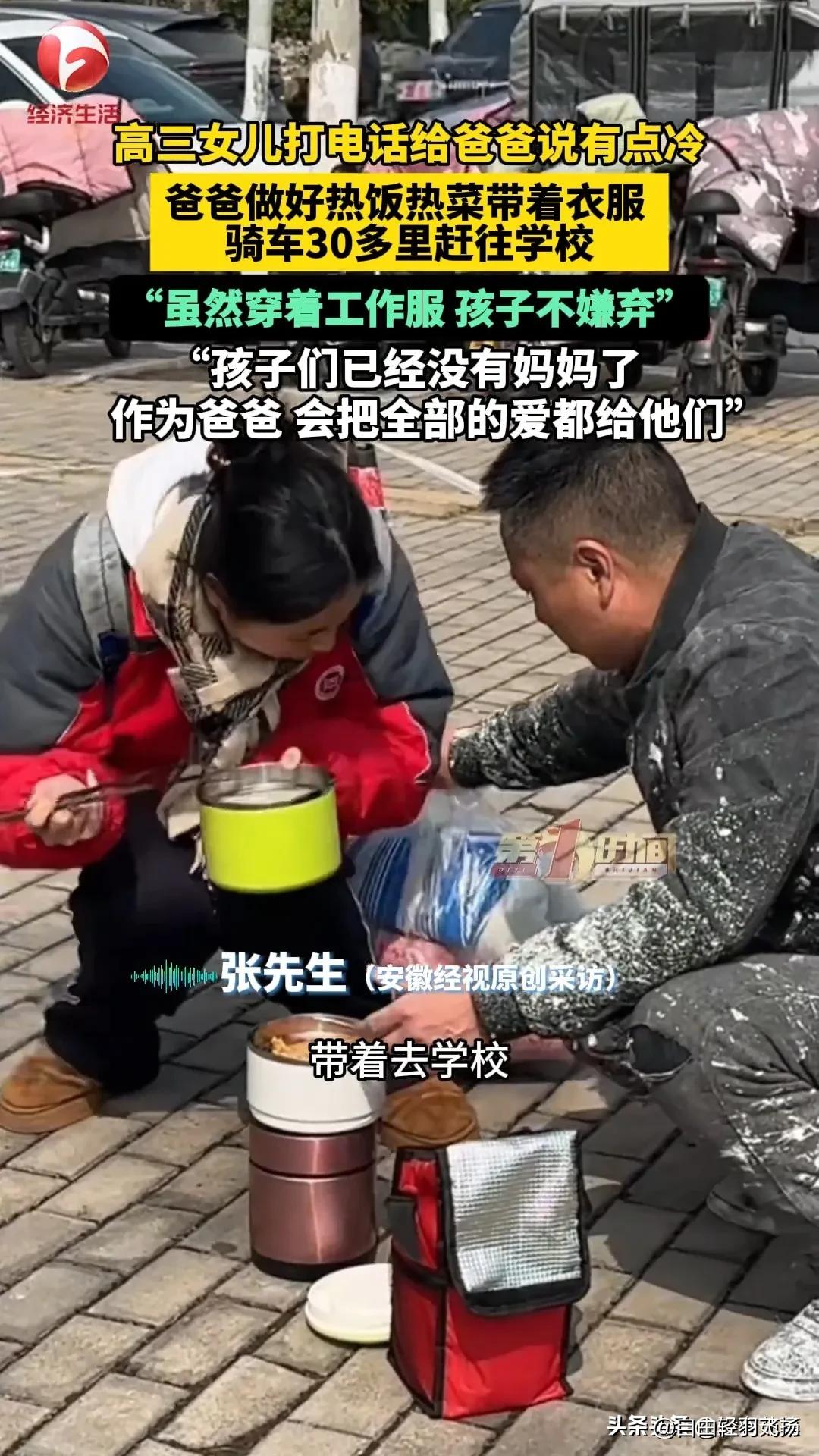 绷不住了!安徽一位高三女儿,晚自习前给爸爸打了个电话,轻轻说了一句:“爸,我有点冷。”就这一句话,单亲爸爸张先生瞬间坐不住了。 那时张先生正在工地干活,手里的工具“哐当”一声放下。来不及换满是灰尘的工装,他一路往家跑。妻子走了好些年,他又当爹又当妈拉扯女儿长大。这孩子懂事得让人心疼,从不说苦喊累,但凡开口,定是实在撑不住了。 到家翻出厚衣服,他又钻进厨房,快手快脚做了女儿最爱吃的热饭。骑着车往学校赶,30多公里的路,冷风像刀子似的刮在脸上。他自己冻得手脚僵硬,心里却只有一个念头:让闺女早点穿上暖衣,吃上热乎饭。 见到女儿,他没说啥漂亮话,就反复叮嘱“多穿点”“好好吃饭”。东西一递,转身又往工地赶,耽误的活还得补回来。有人说他伟大,他只憨憨一笑:“当爹的,不都这样?” 这些年,他对自己抠得厉害。衣服是洗得发白的旧款,顿顿是最简单的饭菜,重活累活从不挑,就为把钱省下来给女儿。学费、生活费、偶尔想买的辅导书,他从不含糊。自己苦点累点不算啥,总得让孩子心里踏实。 女儿也懂这份不易,放学回家就帮着做家务,学习从不用催,成绩单上的进步,是给爸爸最好的回报。她知道爸爸肩上的担子有多沉,从不说要新衣服、好吃的,偶尔提一句“有点冷”,已是攒了很久的委屈。 父女俩就这么互相惦记着,把苦日子过出了甜。工地上的汗水,教室里的灯光,寒夜里的热饭,拼凑出最实在的生活。没有轰轰烈烈,却藏着最动人的默契——你为我拼尽全力,我为你努力争气。 有人说,这位爸爸的工装沾满灰尘,却比任何名牌西装都体面。那30公里的寒风里,藏着比山还重的父爱。中国式的父亲,大多不善言辞,却把所有温柔都揉进了行动里。他们或许没本事给孩子最好的,却一定把能给的都给了。 孩子冷了,他不管自己在干啥,先把温暖送到;孩子饿了,他宁愿自己少吃点,也要让孩子吃饱;孩子受委屈了,他再难也要为孩子撑出一片天。这份爱,不花哨,却最顶用。 想想我们身边,是不是也有这样的父亲?或许他从没说过“我爱你”,却总在你需要时出现;或许他对你很严厉,却在你看不见的地方默默付出。他们的爱,像老棉袄,不时尚,却最暖和;像老黄牛,不张扬,却最靠谱。 这位安徽爸爸的故事,让人心里一暖。不是因为多轰轰烈烈,而是因为太真实。生活里的苦,被这份父爱轻轻接住;日子里的难,因这份体谅慢慢化解。这大概就是家庭的意义——再难,有人陪你扛;再冷,有人给你暖。 愿每个懂事的孩子,都能被温柔以待;愿每个用力生活的父亲,都能被岁月温柔相拥。这份藏在寒风里的爱,值得我们记在心里。