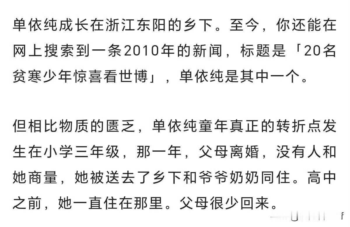 看完这两段关于单依纯的文字,心里确实挺不是滋味的,这种感觉很复杂,既有对她早年境遇的心疼,也有对她如今表现的敬佩。 想对单依纯说: 小单,你现在已经不再是那个只能靠折心形纸来寄托思念的小女孩了。你的歌声治愈了无数在深夜里哭泣的人,其实你也在治愈曾经那个孤独的自己。虽然童年有很多遗憾,但正是那些灰暗的底色,才让你的歌声有了现在的厚度和光芒。现在的你,已经拥有了选择权,也拥有了被很多人爱着的权利。希望你在舞台上发光的时候,也能学会好好爱自己,去拥抱那个躲在角落里、吃着瓜子等妈妈回家的小女孩。你值得所有的回应,也值得所有的美好。 从乡下留守儿童到双色代言在手、加冕最佳女歌手的乐坛顶流,单依纯把童年的孤独熬成了歌里的深情,把沉默化作了舞台上的光。她不再是那个只盼回信的小女孩,而是用《永不失联的爱》打动全网的纯妹妹,是靠真性情与真声音站上巅峰的新生代天后。期待她继续向阳而生——起点是荒原,心中有歌,便能开出最绚烂的花。