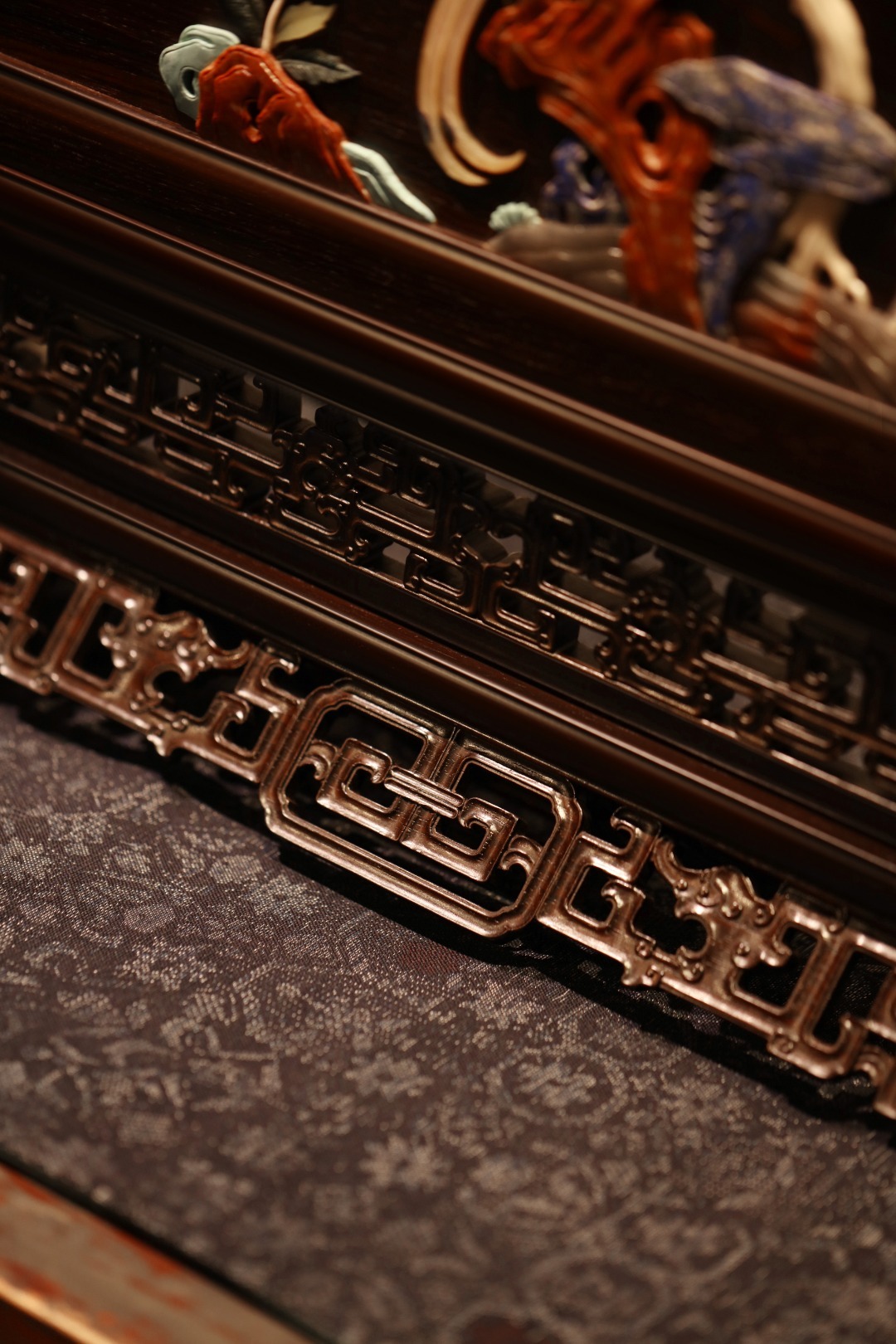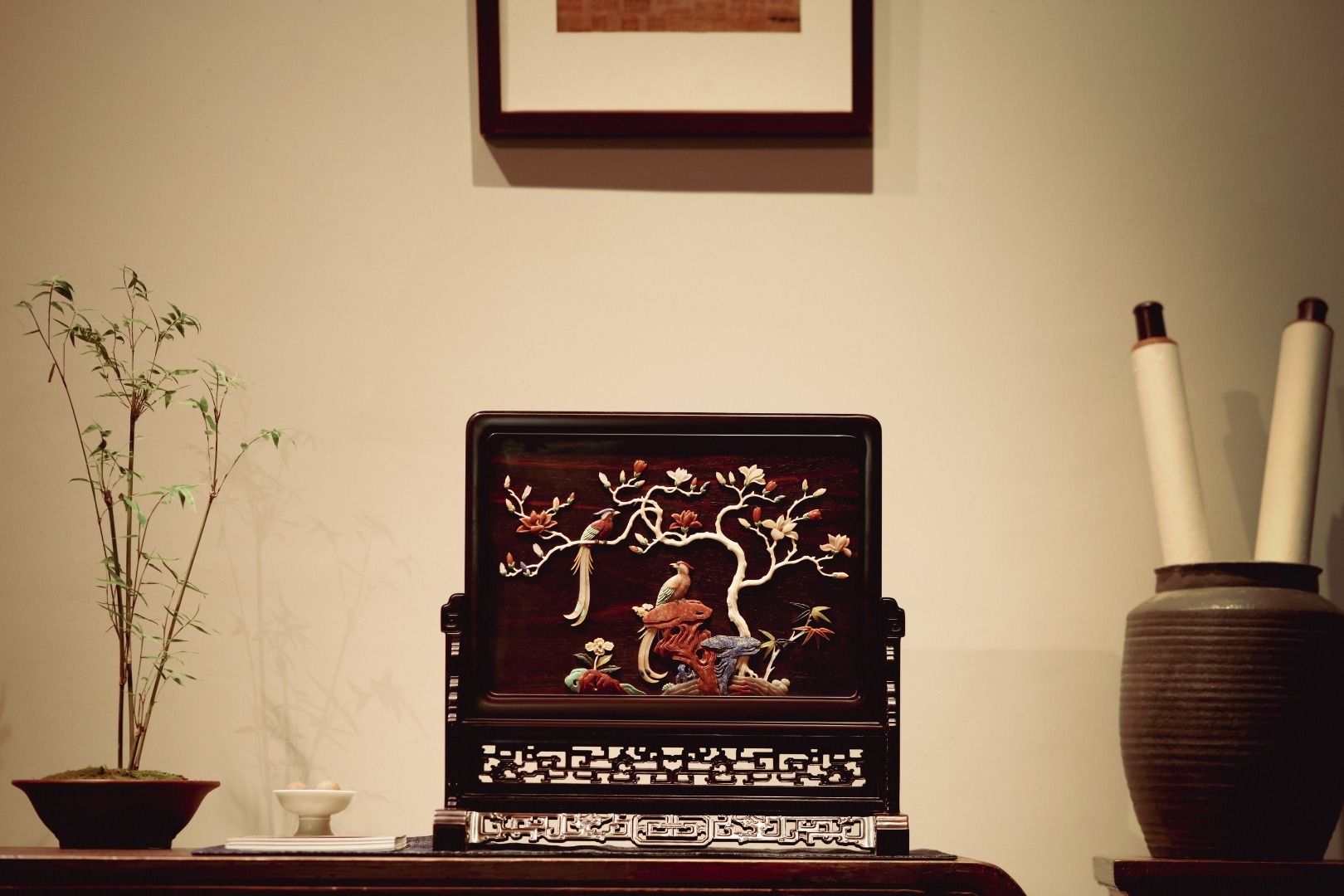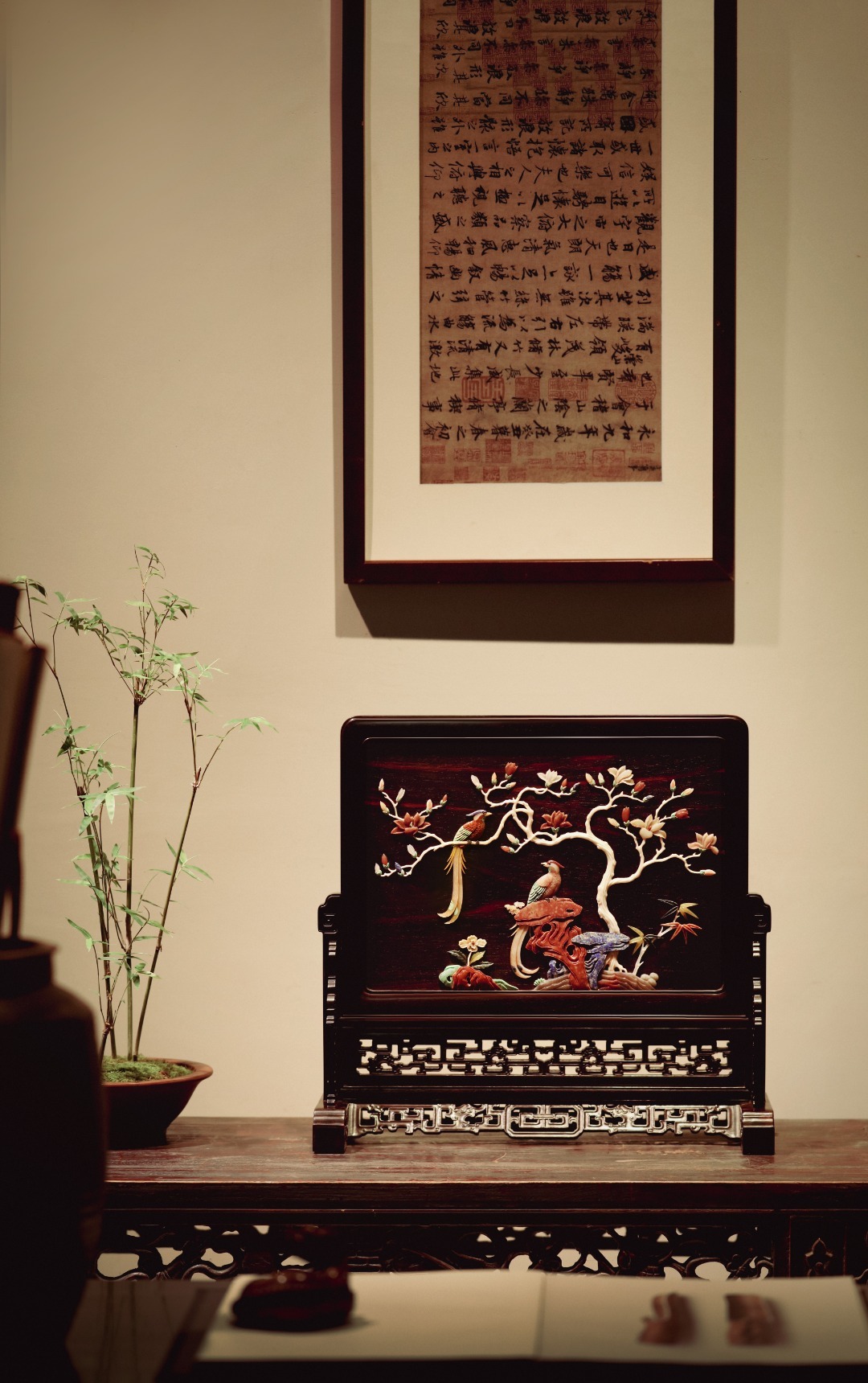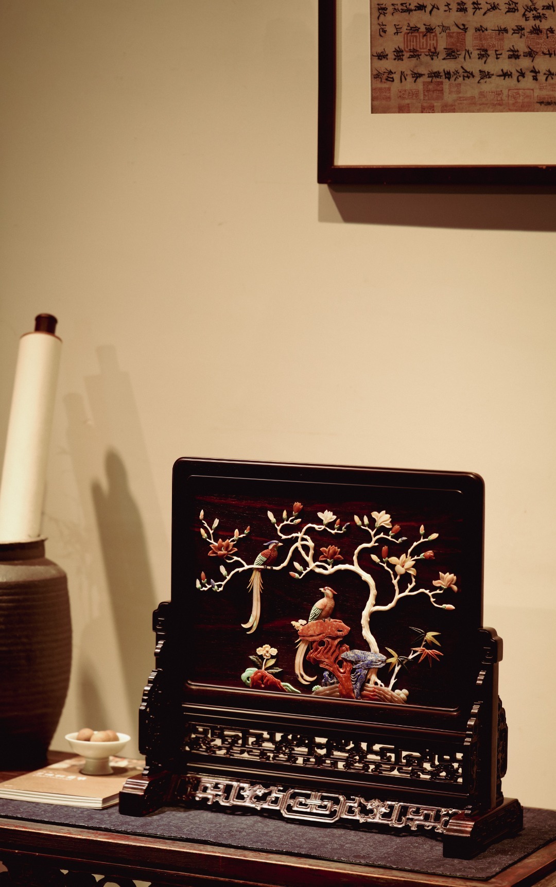 大红酸枝攒框,古韵新作,独板屏心百宝嵌花鸟图,配色典雅,寓意吉祥,置案清赏,添祥和雅意。